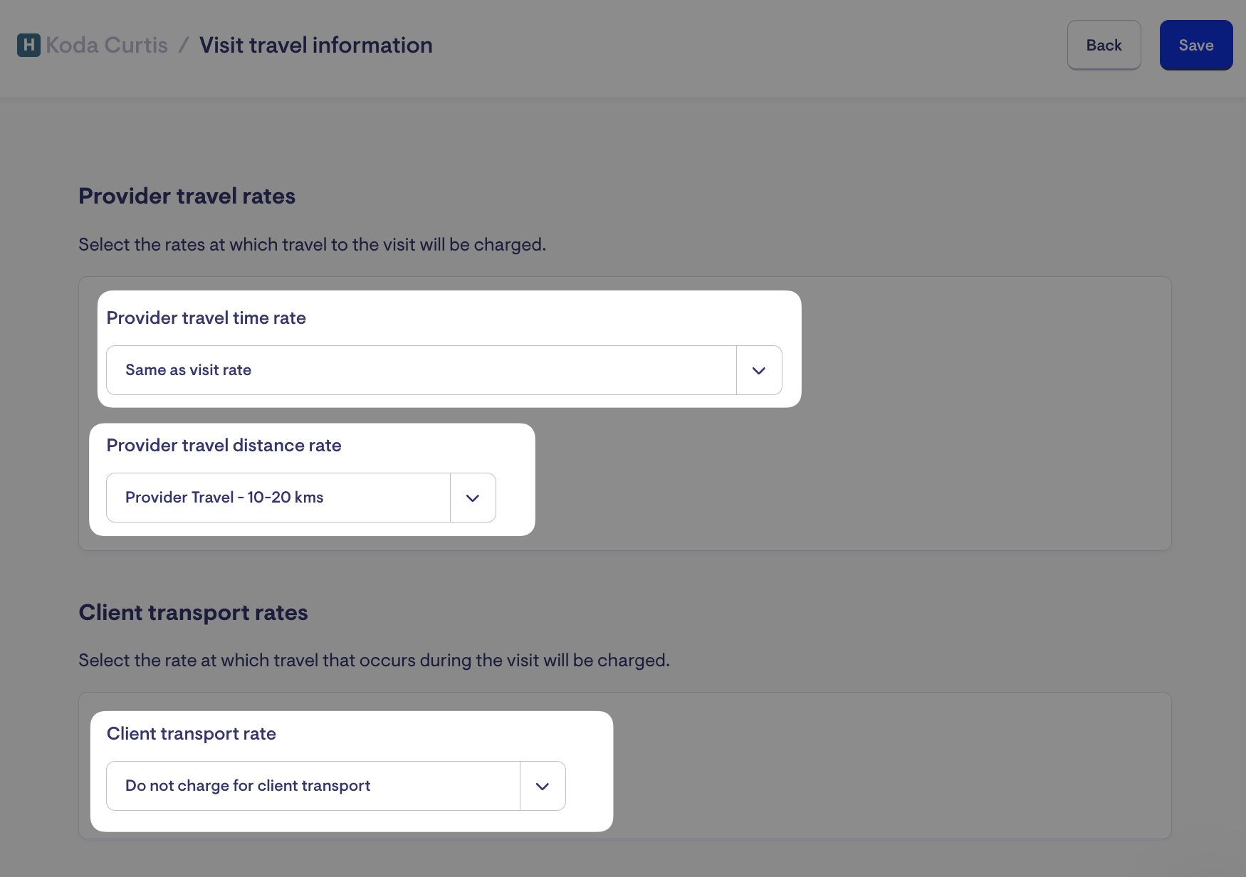 When creating a visit and if applicable, you can select the rate at which the client will be charged for travel within the visit or schedule rule travel information page.