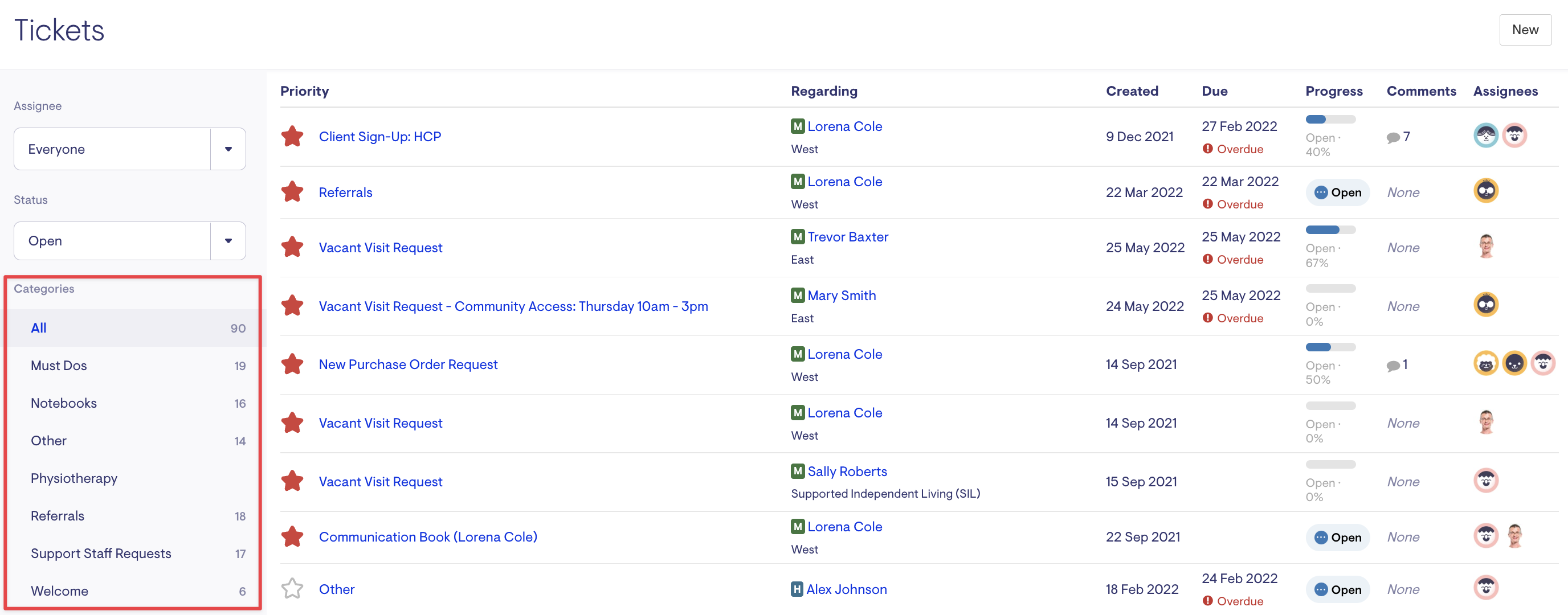 In the Ticket Inbox, tickets can be viewed by a particular Ticket Category.