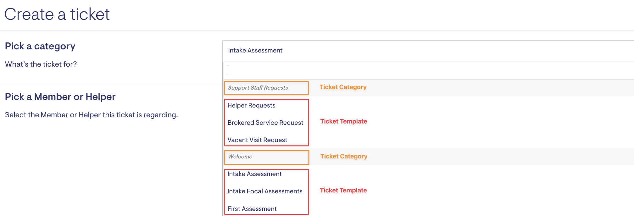 When creating a new ticket from the Ticket Inbox, the Ticket Category will group the Ticket Templates.