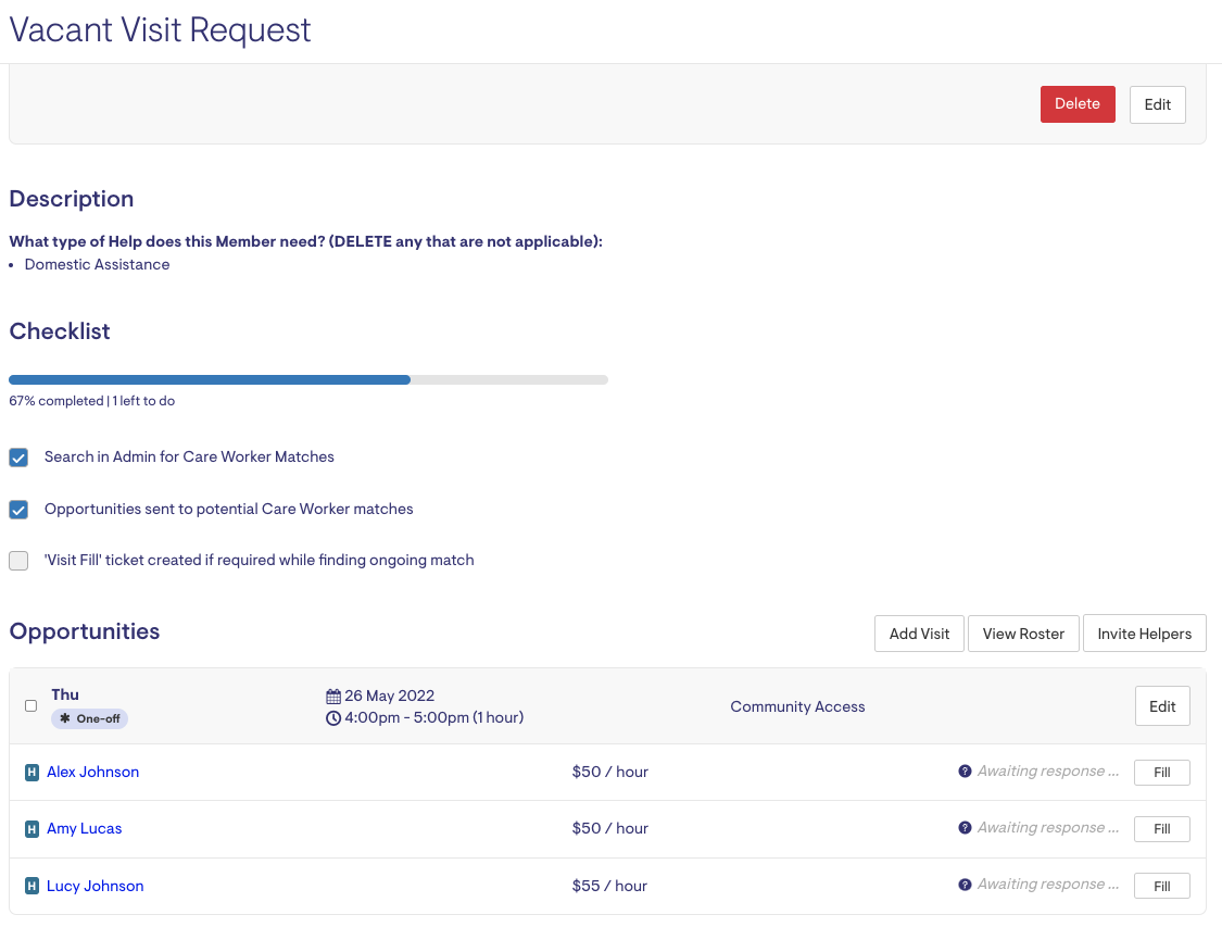 A vacant visit ticket allows you to send opportunities to Helpers to fill one-off or recurring visits. The Helper will receive a notification via the app and have the option to respond to advise if they are available or not.