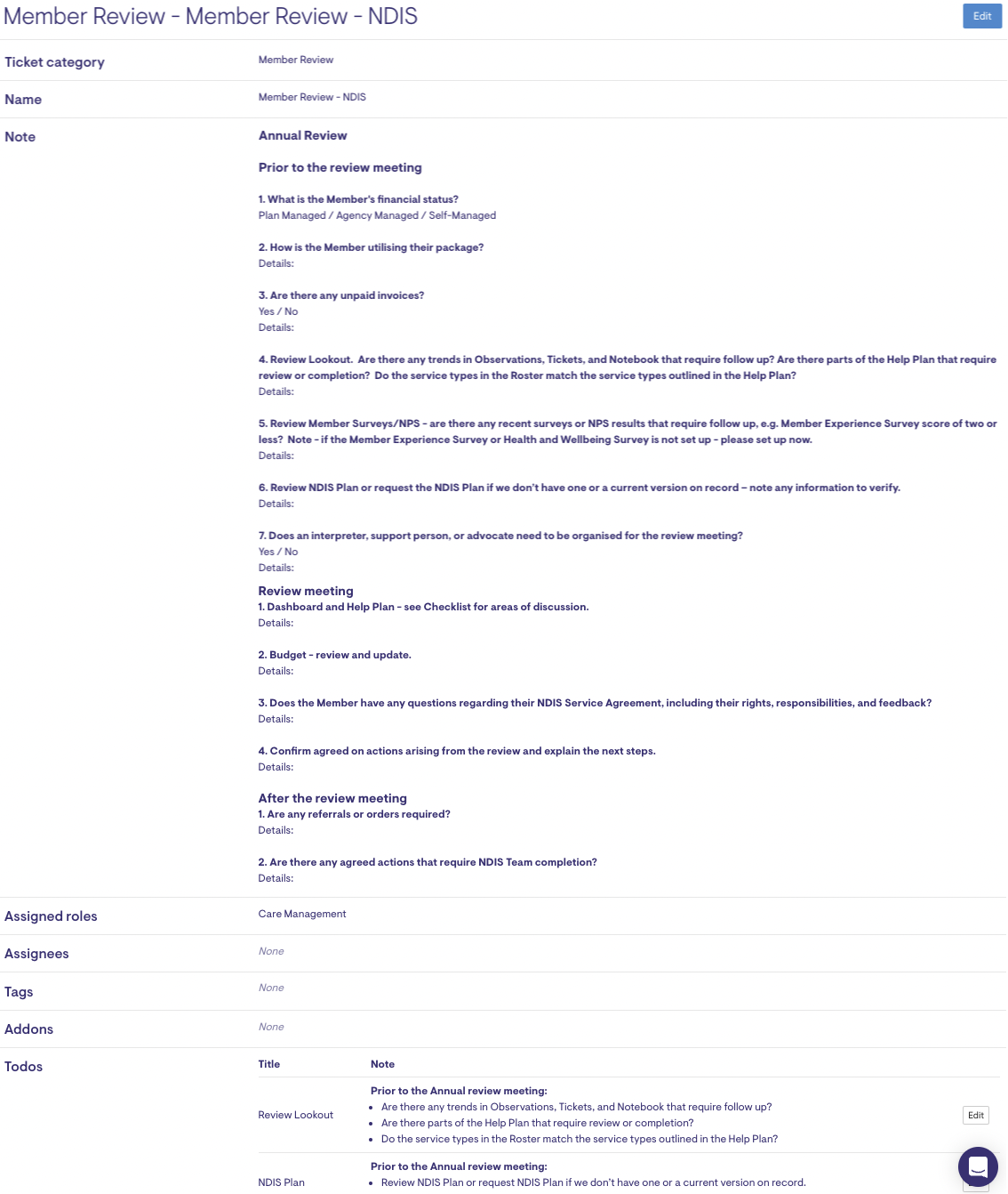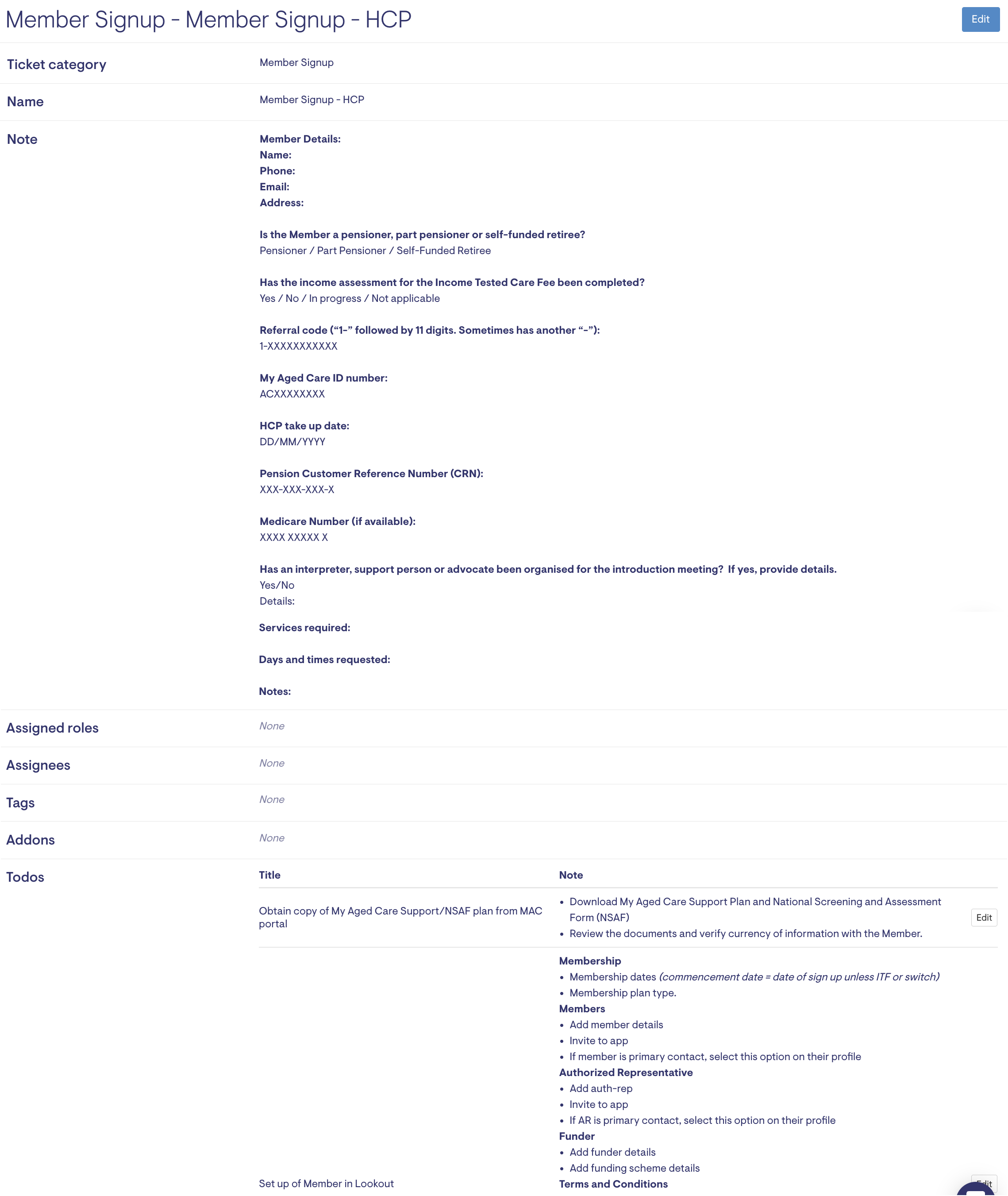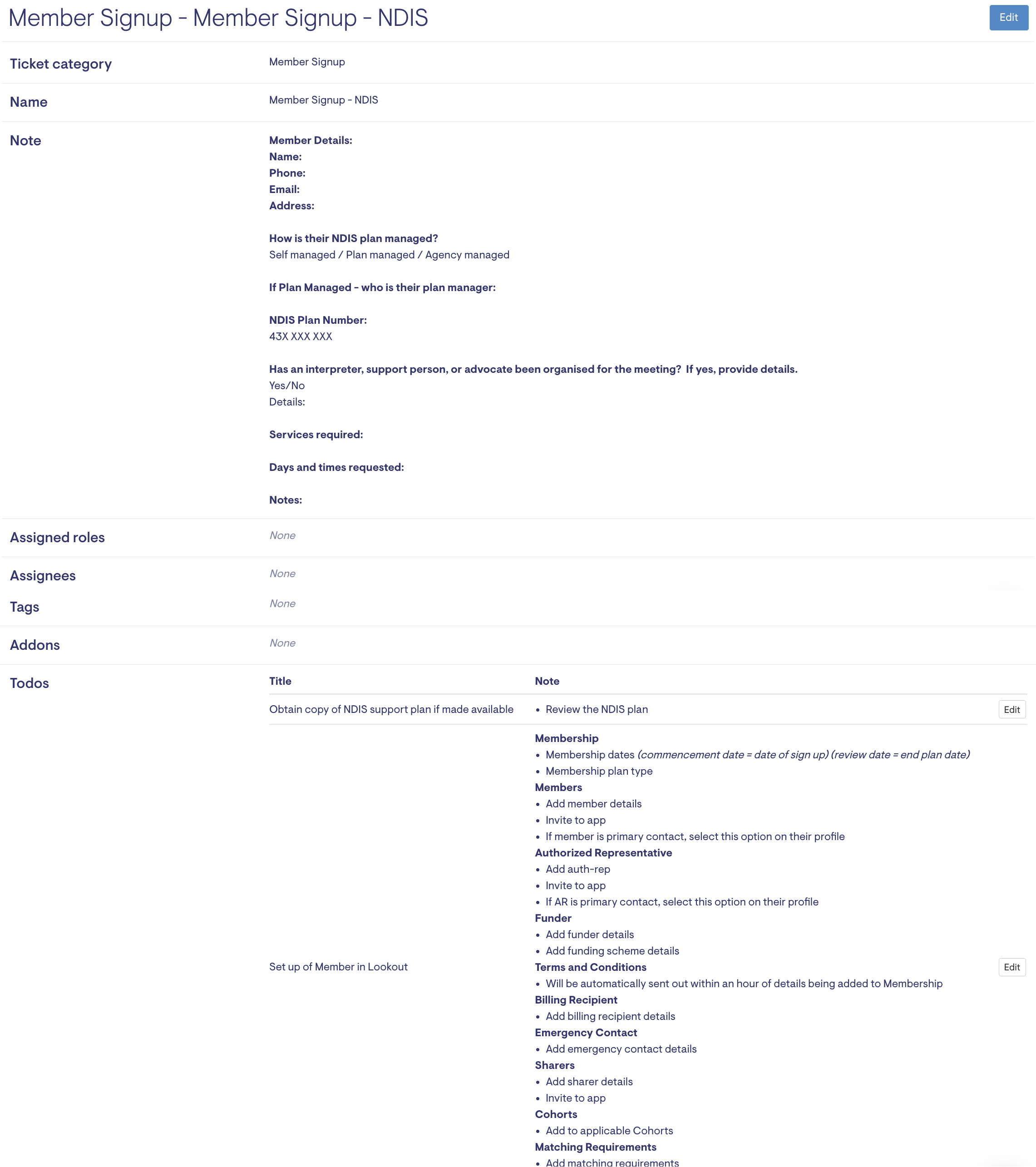 To ensure all of the required information is collected when signing up new clients, use the Note section. The information added into the Note section will appear each time the ticket is selected. The staff member completing the ticket can then edit and add the relevant information for the new client. Todos will keep track of what has been actioned, such as obtaining relevant documentation, setting up the new client in Lookout and finding a Care Worker/Helper match. If a particular user or role usually completes Member Signups, you can also assign this in the ticket template.