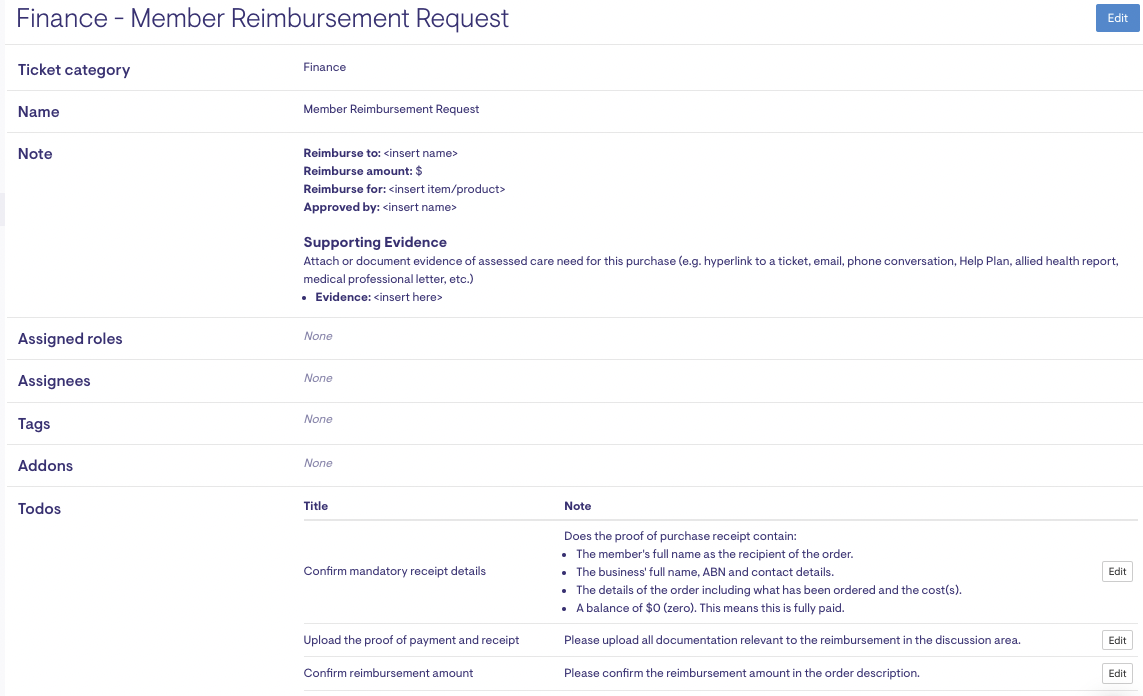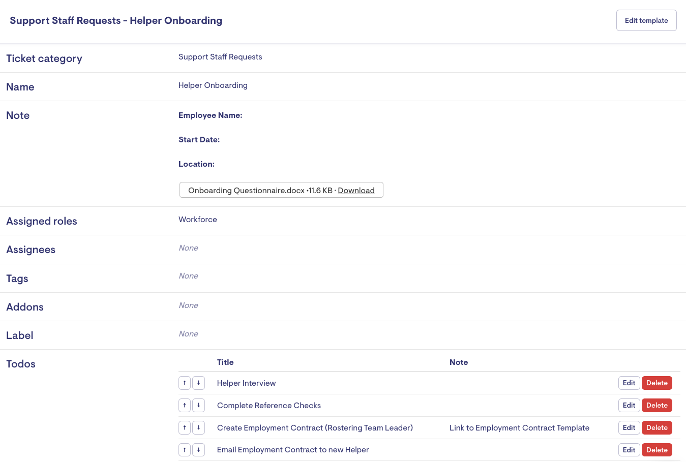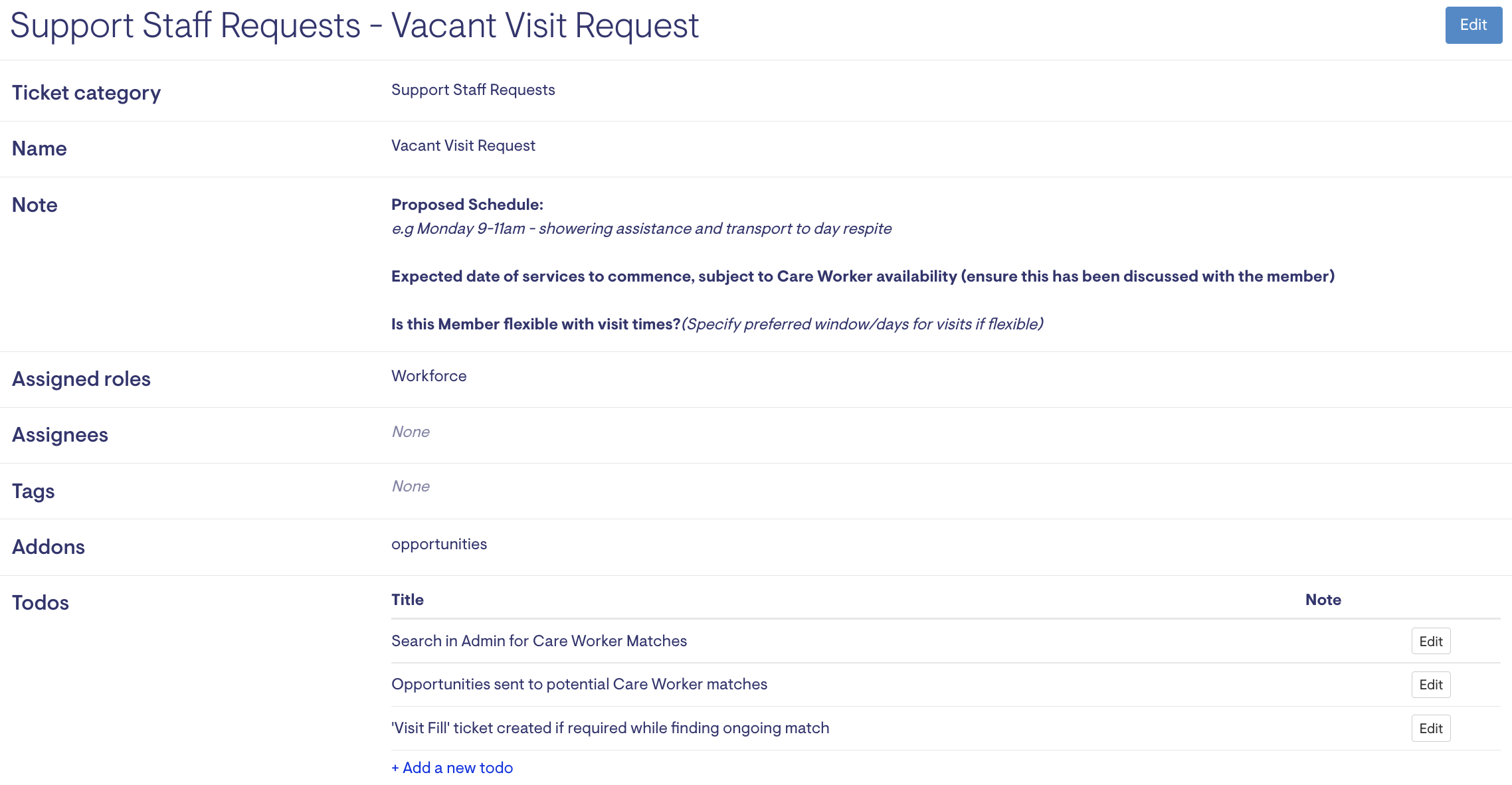 To ensure all of the required information is collected when signing up new clients, use the Note section. The information added into the Note section will appear each time the ticket is selected. The staff member completing the ticket can then edit and add the relevant information for the new client. Todos will keep track of what has been actioned, such as obtaining relevant documentation, setting up the new client in Lookout and finding a Care Worker/Helper match. If a particular user or role usually completes Member Signups, you can also assign this in the ticket template.