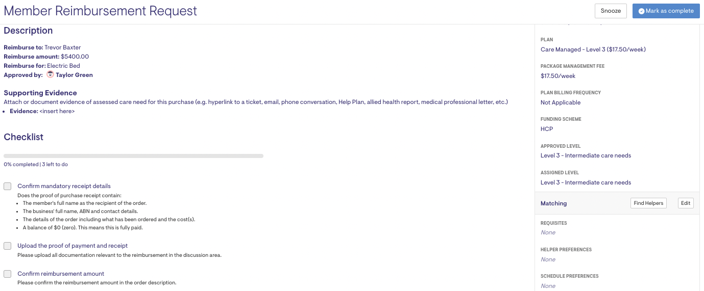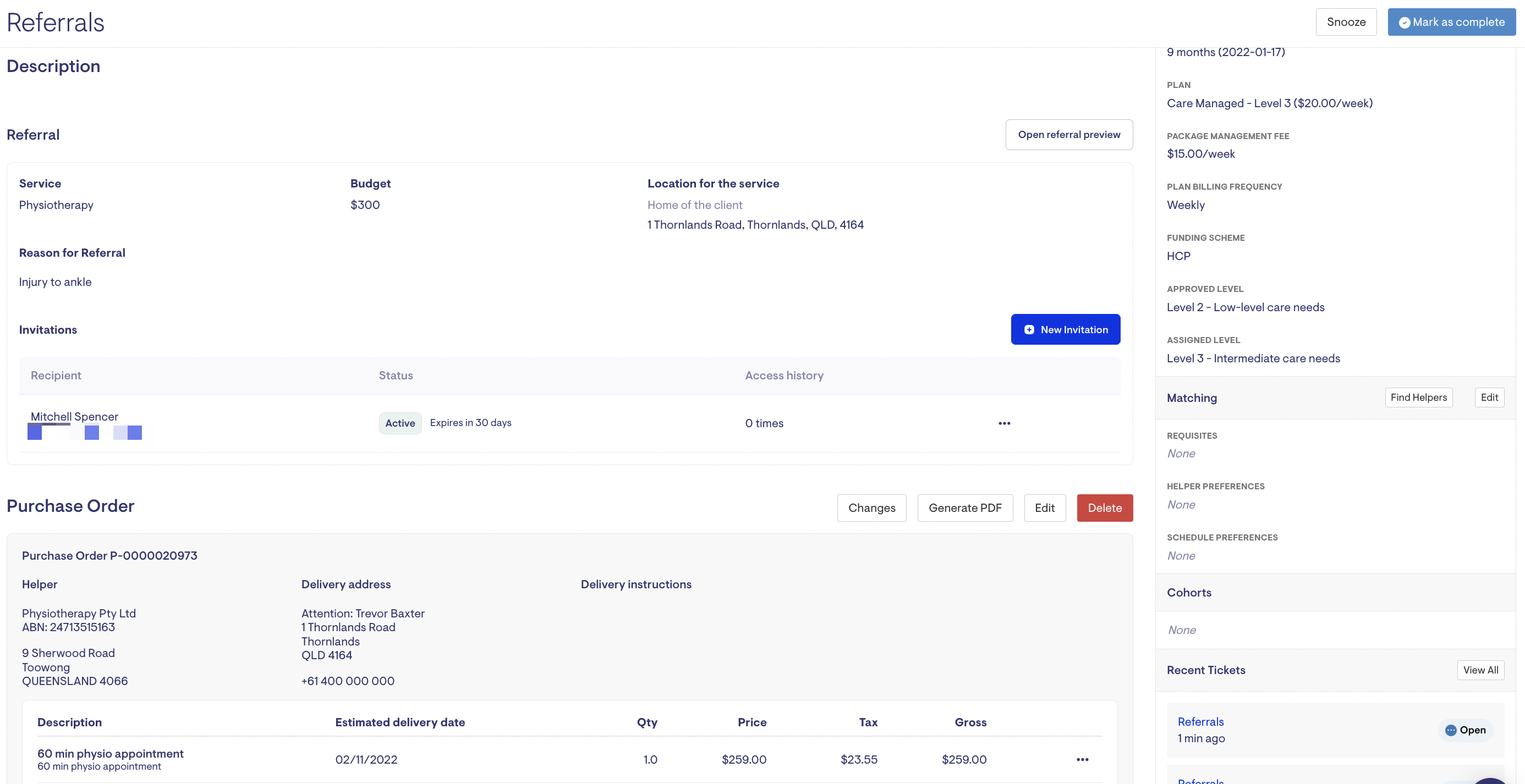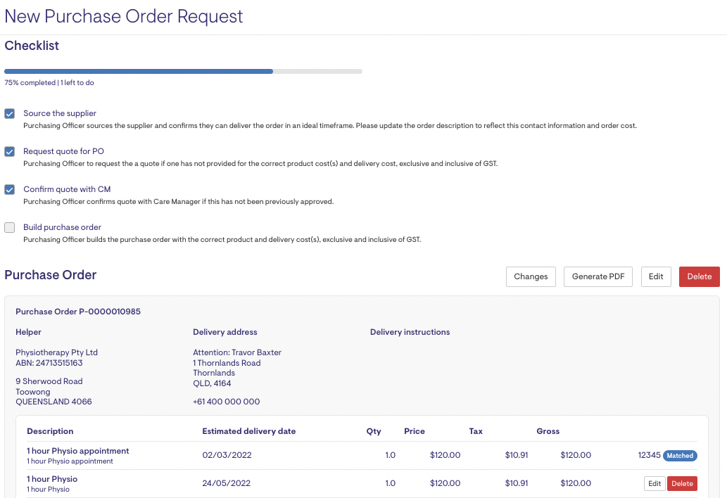 Purchase Order tickets, allow you to track one-off purchases such as equipment or recurring purchases such as weekly meals or allied health appointments. Within the ticket, you'll have the option of generating a purchase order request to send to the supplier. Once you receive an invoice from the supplier, you can match it with the purchase order and upload it ready for the next billing and payment run.