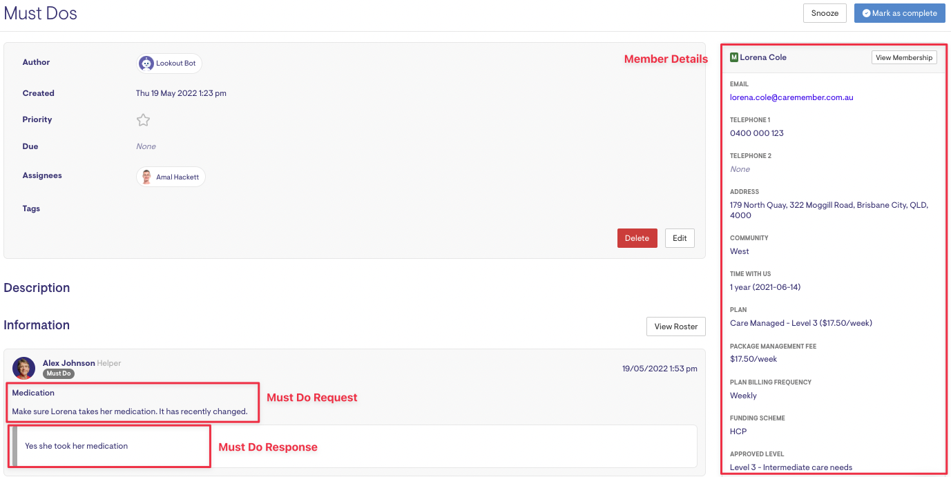 A Must Do is a way to request that a care worker completes a specific task as part of that specific visit. An example might be “Please change wound dressing and report how the wound is healing”. The care worker is required to acknowledge the message and provide a report back via the check-out process to notify the Care Manager. Lookout will notify the Care Manager of the must do response via a ticket. The Care Manager can then complete further action via the ticket.
