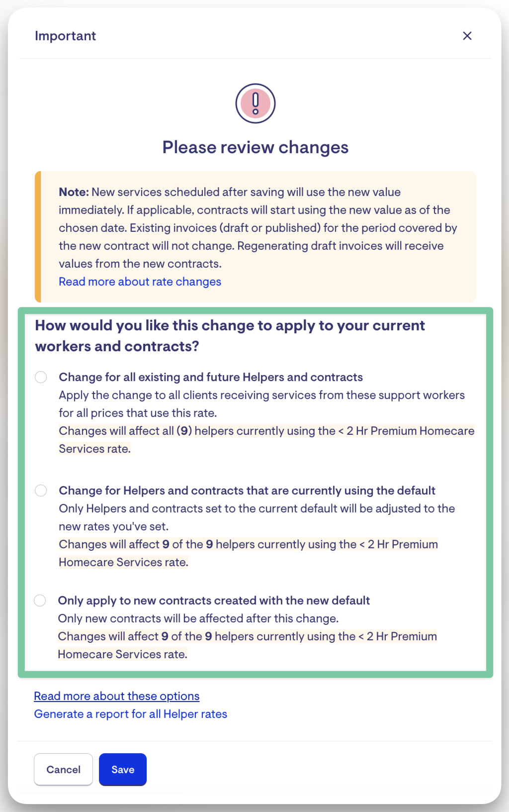 If you make changes to the rate settings, the rate change review screen will appear. This window allows you to select which helper and member contracts should be updated and set the effective date.