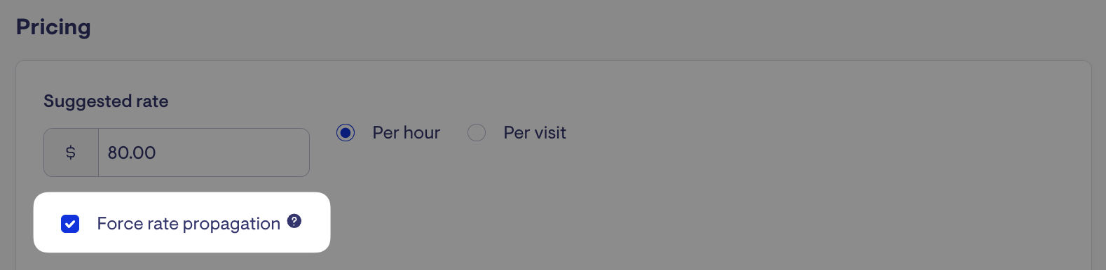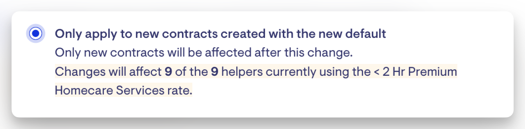 This option applies the rate change only to new contracts or new helper-member relationships where the helper has never provided services to the member before. The changes take effect immediately, so any new contracts created after propagation will use the new rate.