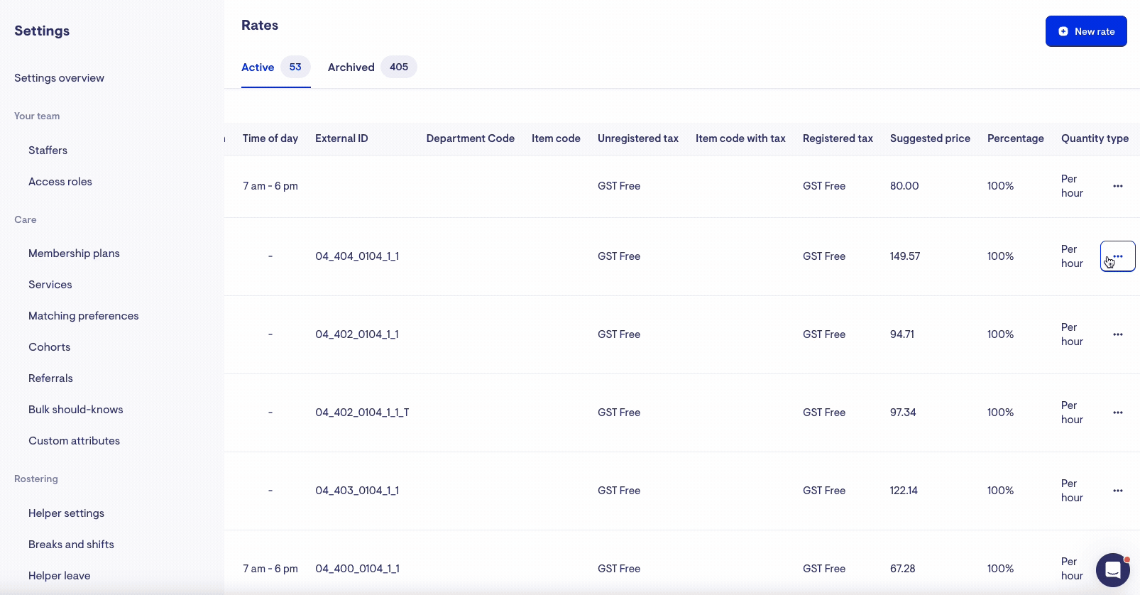 On the Visit Rates page, you will see tabs for Active and Archive rates and an option to add a New Rate. To update a visit rate, you can find the rate you want to modify and click the three dots next to the 'Quantity type' column.