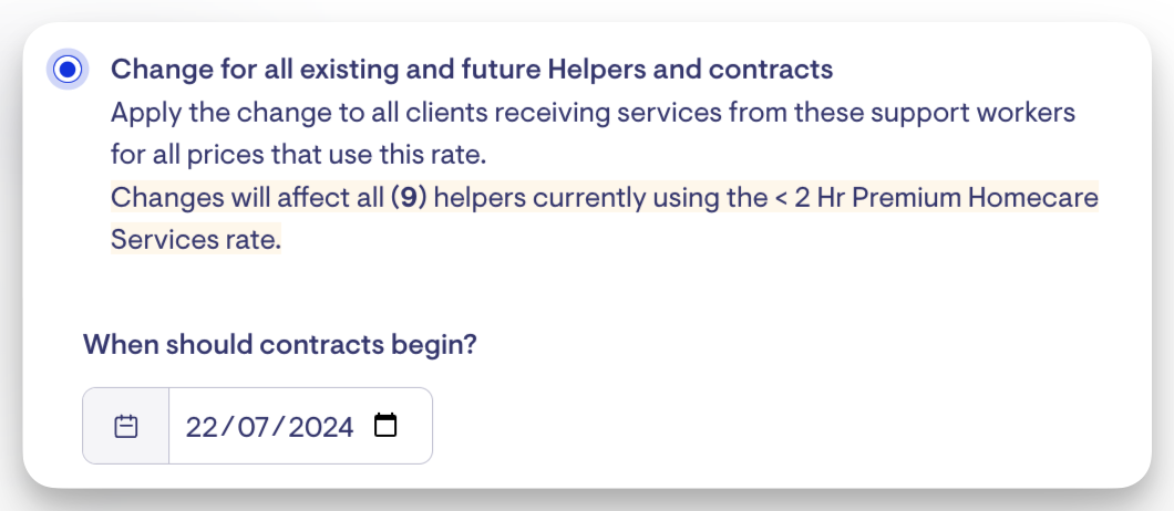 Existing contracts between support workers and clients will expire and be replaced with new contracts at the new rate, starting from the selected effective date.