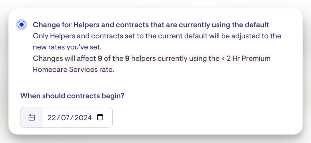 This option applies the rate change only to helper clients with the previous rate in their contracts. As per their existing contract, any helper or client with special or custom pricing for this visit rate will be excluded from the update.