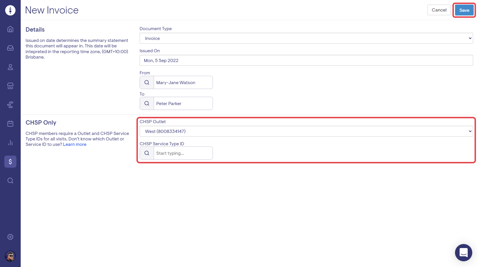 Select Invoice as the document type, choose the desired Issued On date along with who the invoice is From and the CHSP funding scheme member in the To fields.