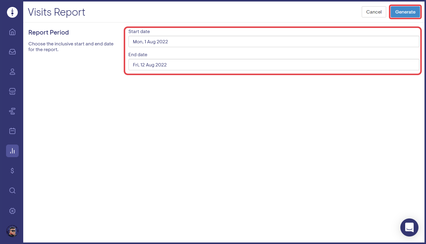 Select Visits Report, enter your Start and End dates and then select Generate.