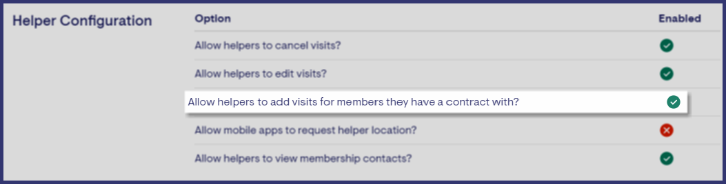 Included the option in Helper Configuration to allow helpers to add visits for members they already have a contract with.