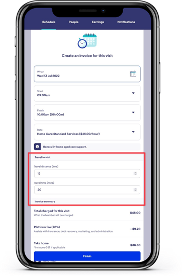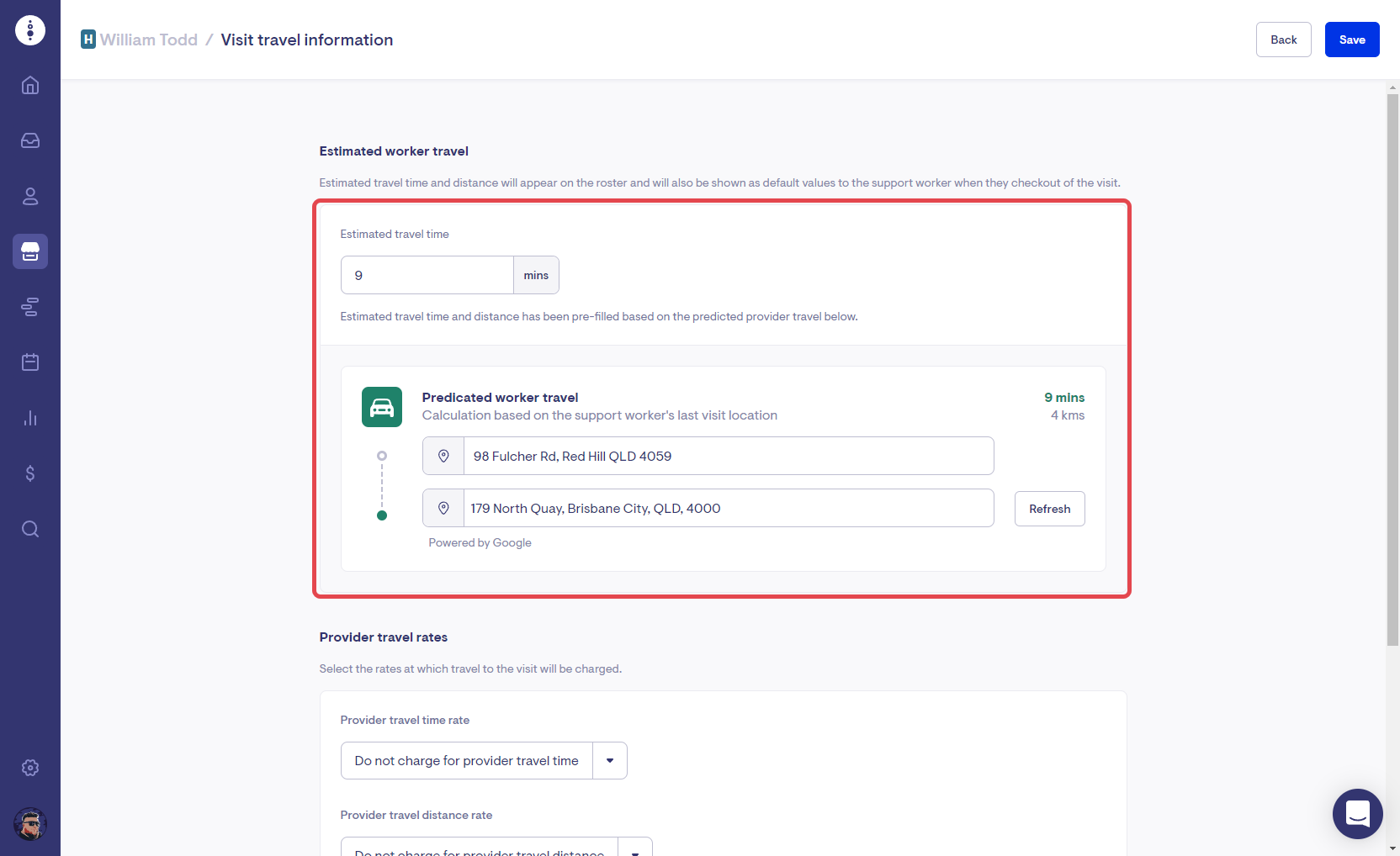 This will take you to the Visit travel information page. Here, you can enter the estimated travel time which will appear on the worker’s roster. Information entered here will pre-fill provider travel on check-out for workers.
