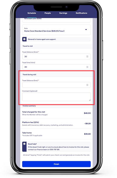 When checking out of a visit, workers will be asked to input provider travel time and distance. If you have assigned an estimated time and distance at visit creation, these values will pre-fill in the worker’s app. Workers can change this value if required before checkout.