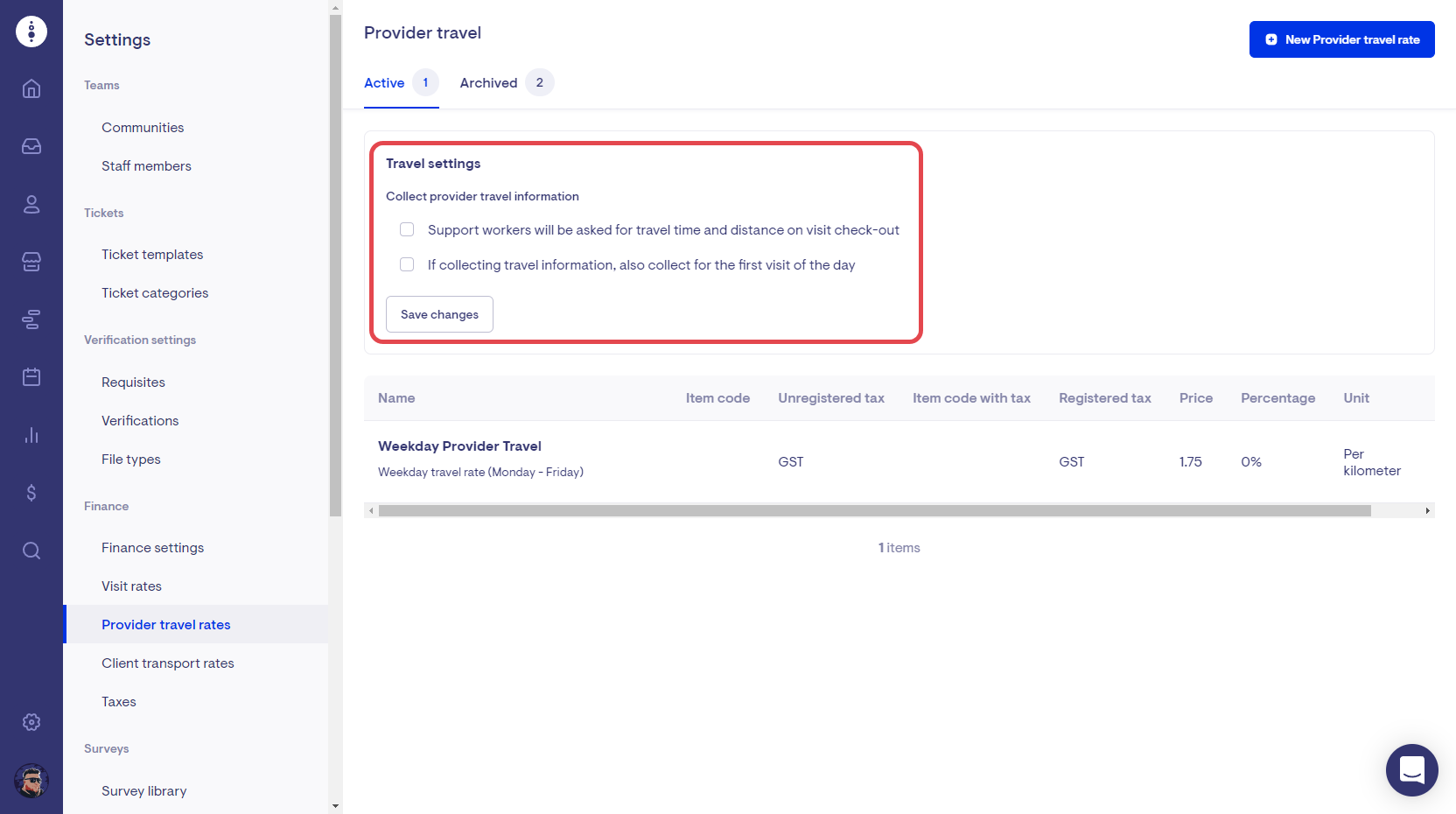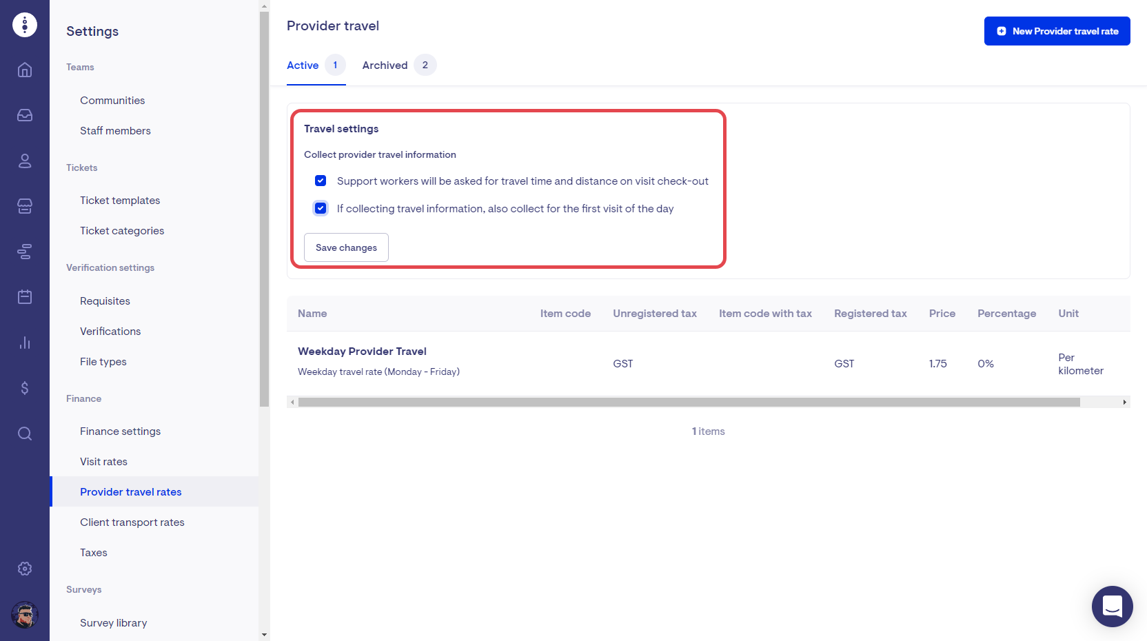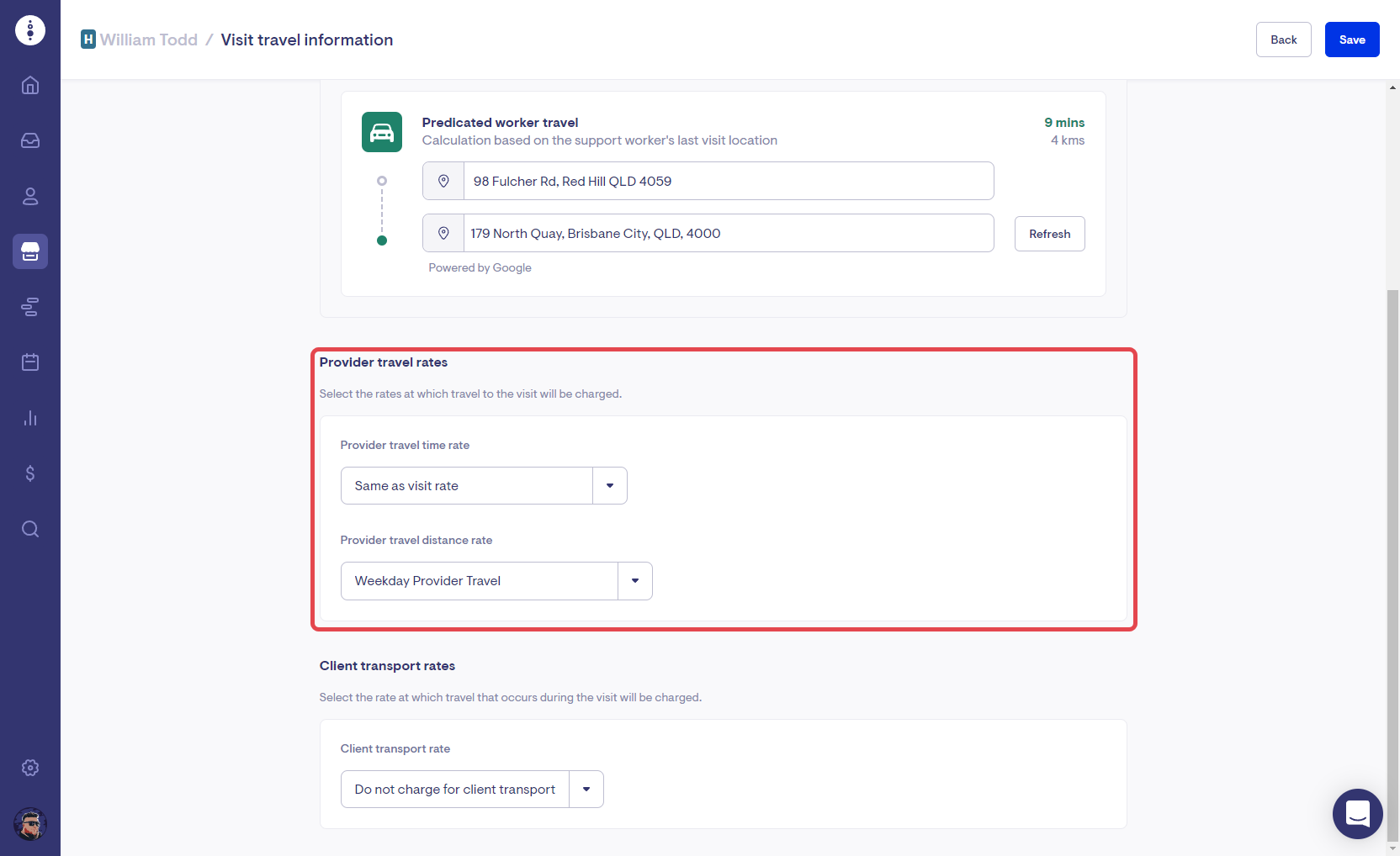 Once membership plans have been setup and added to the relevant members provider travel rates will appear on the travel information page. Select the rate at which you would like to charge provider travel to clients