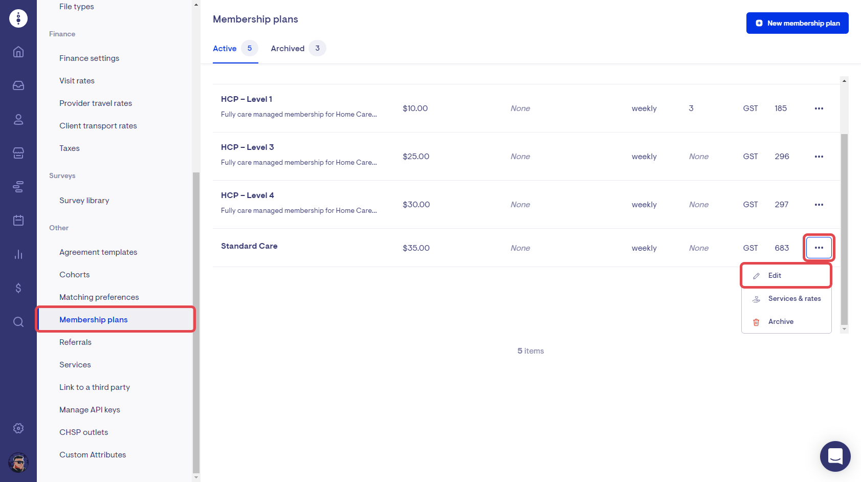 If your organisation has existing membership plans, from settings select Membership plans, select the more options menu (▪▪▪) next to the desired plan and then select Edit.
