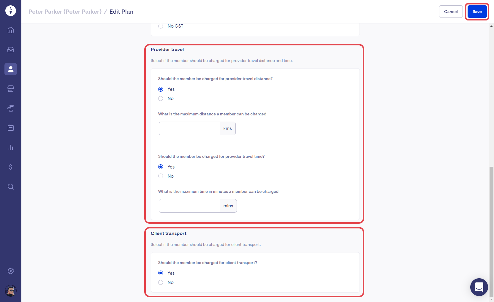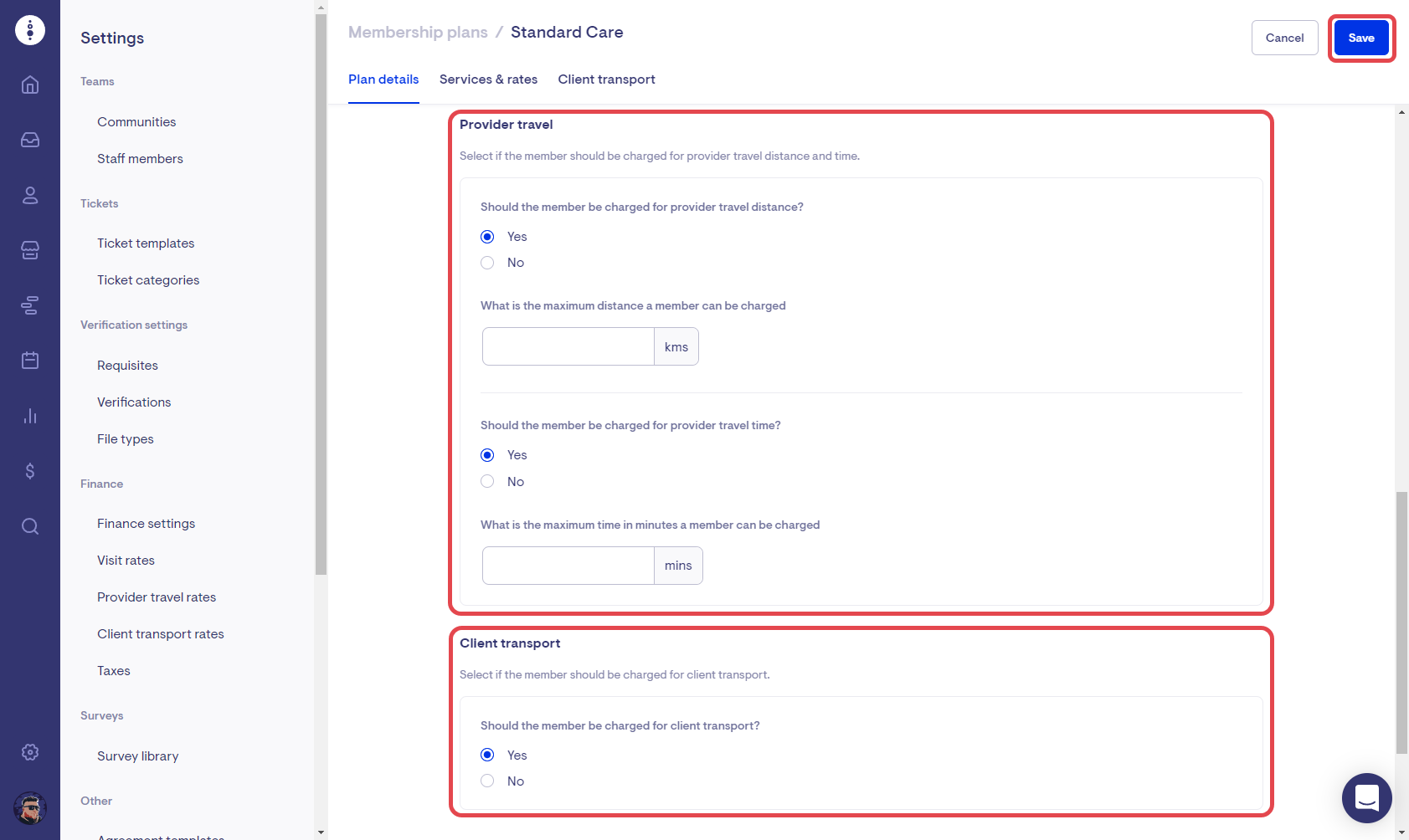 On the plan details page, scroll down to the travel information section. Select whether members on this plan should be charged for provider travel and/or client transport and then select Save.