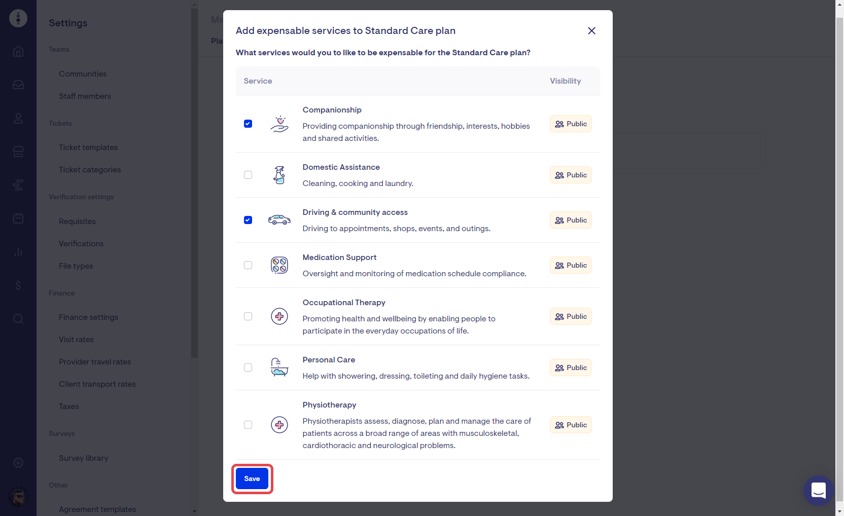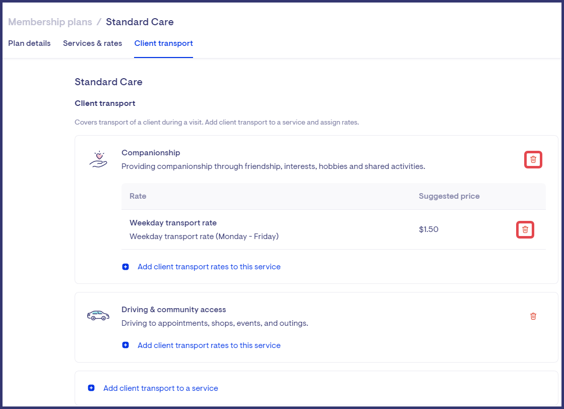 After selecting the relevant travel options in the plan details, you will also need to associate the relevant visit services with a client transport rate. This will determine whether the clients can be invoiced for client transport for a particular service.