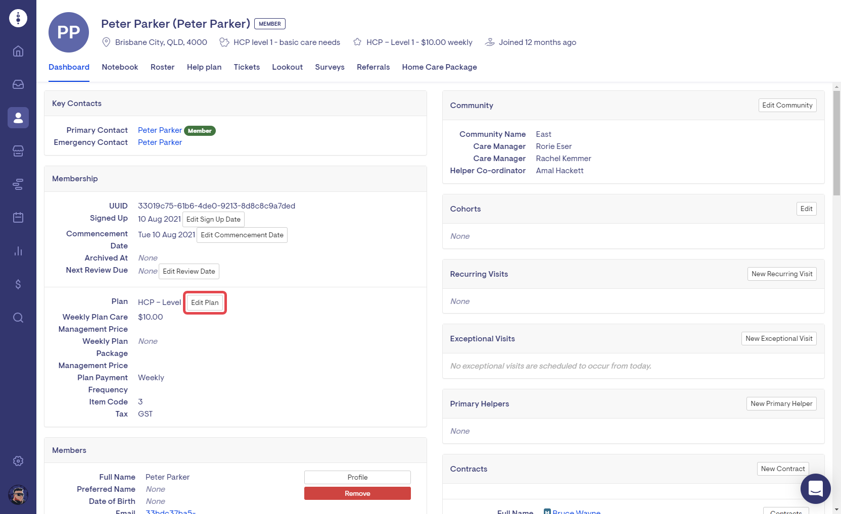 To edit travel information at a per member level (i.e. to deviate from the default membership plan settings), first select a membership, then under Membership, select Edit Plan.