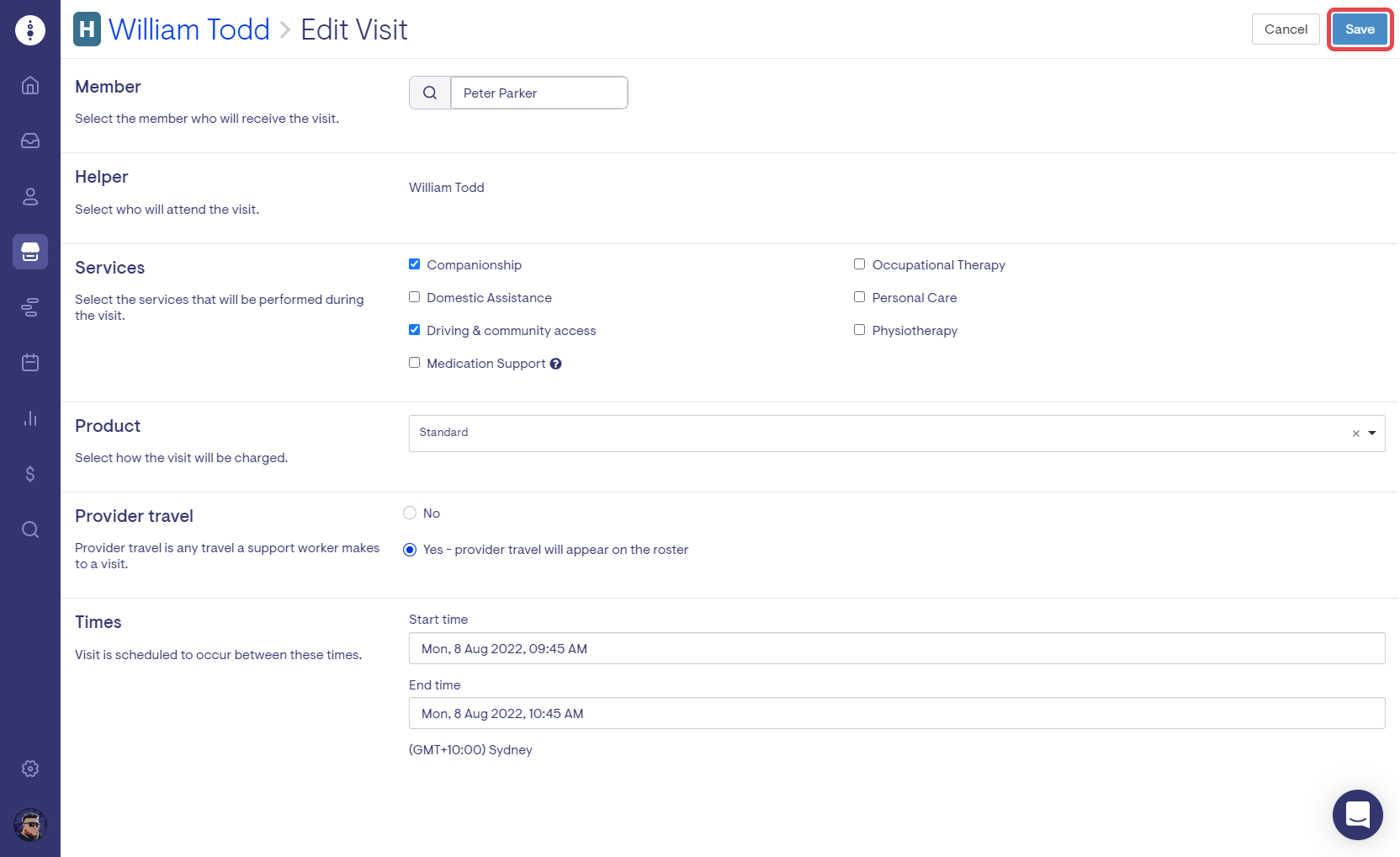To schedule travel time in a worker’s roster, create a visit (exceptional or recurring), fill in all the relevant visit details and select Save.