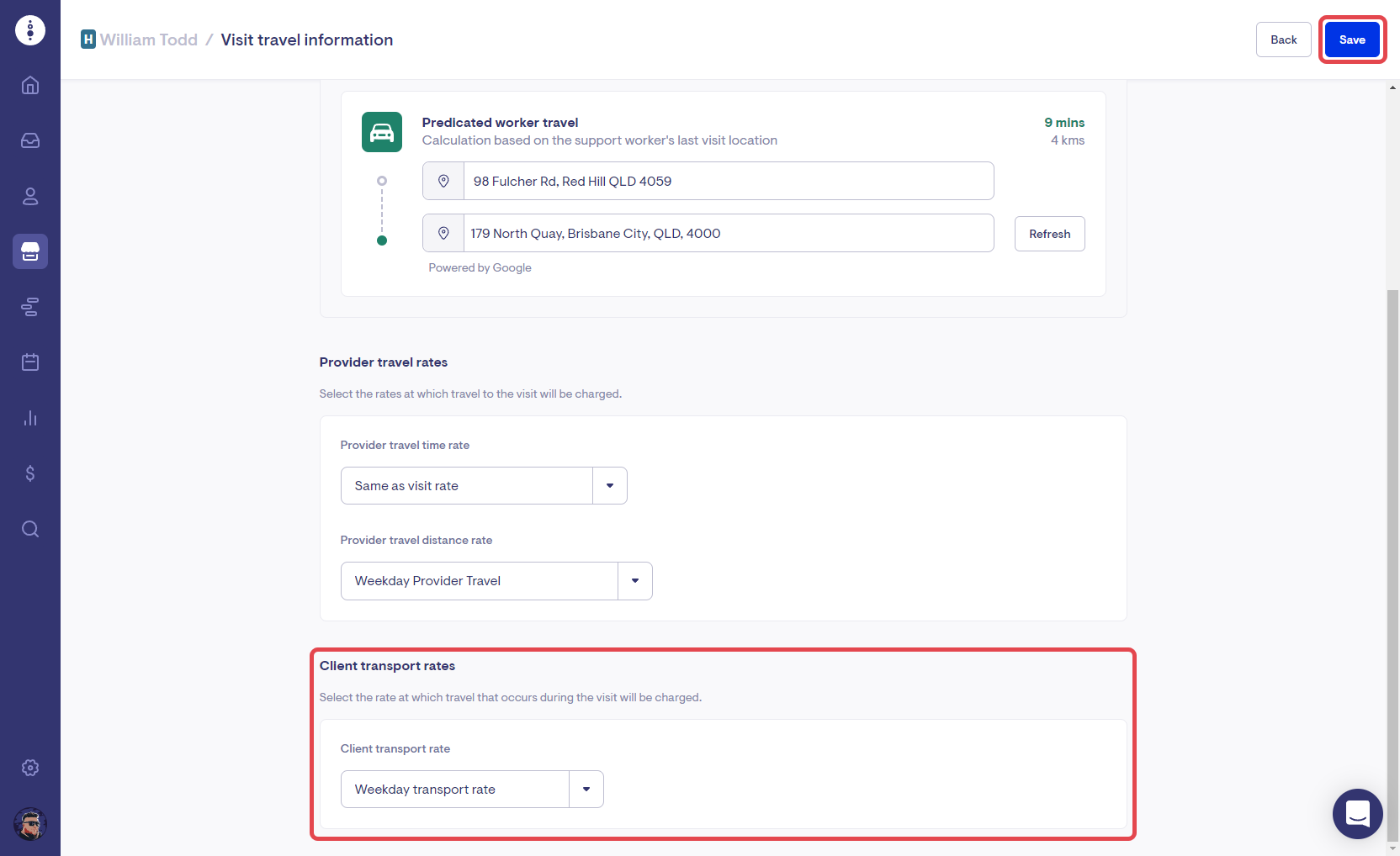 If a service that has a client transport rate attached to it is selected for a visit, then the client transport rate selector will appear on the travel information page. Select the relevant rate for the visit.