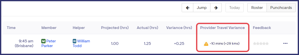 Any variance between what the worker inputs on checkout for provider travel and the expected values will appear on the Punchcards screen.