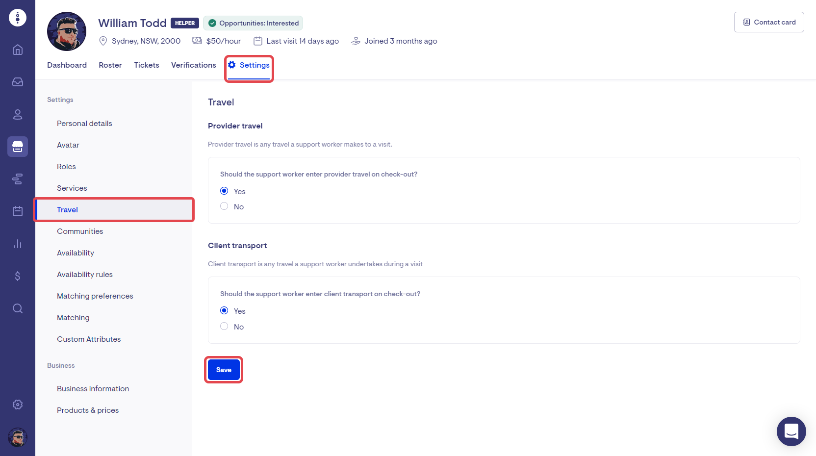 You can choose which workers to collect travel information from through Lookout's Helper settings. From the helper settings screen, select Travel. Select the appropriate options under Provider travel and Client transport and then select Save.