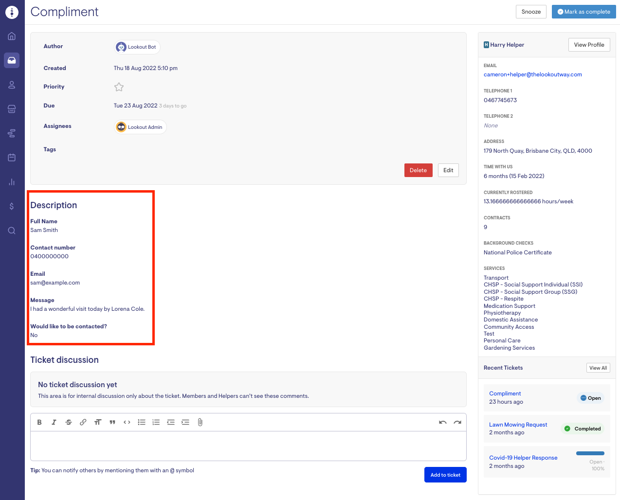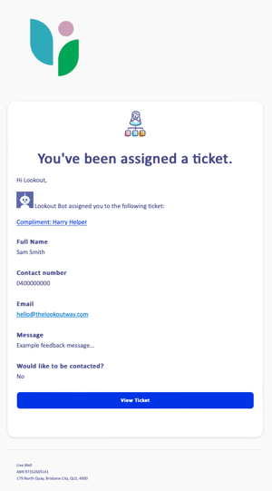 The Complaints & Feedback Form is a way for Helpers, Members and Staff to submit compliments, complaints and other feedback relating to services your organisation deliver. When feedback is submitted, a ticket containing the details is created in Lookout, and an alert is sent to the relevant staff member to review and action.