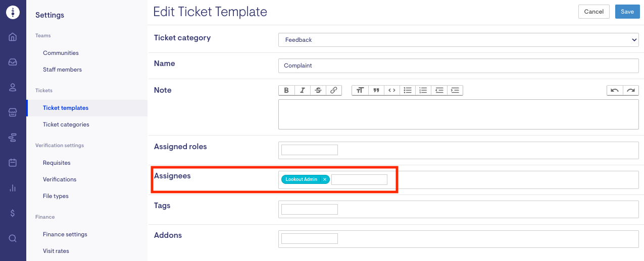 The ticket assignee can be customised for each feedback ticket template by navigating to Ticket Templates under settings. Click on the template to be edited and enter who should be notified in the Assignees field.