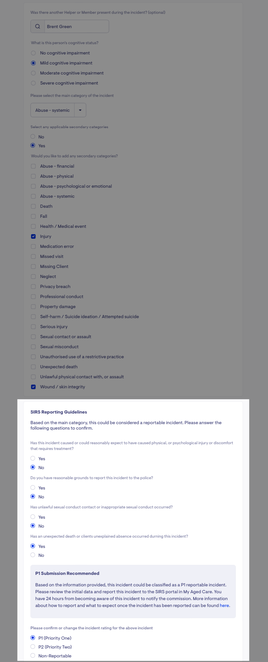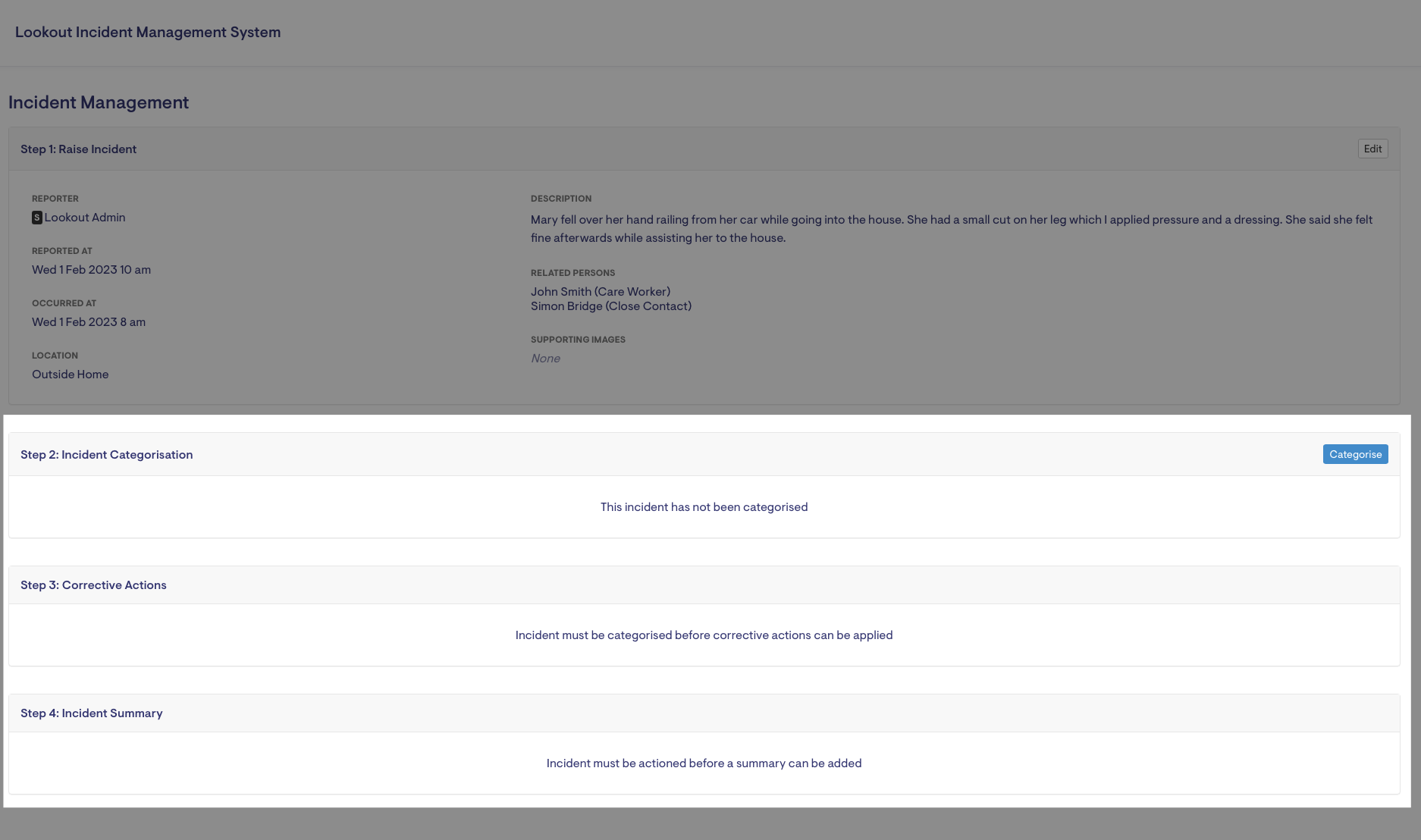 Lookout Incident Management focuses on the safety, health, well-being and quality of life of the consumers at your service. Categorisation of the incident aids in assessing the support and assistance required to ensure the safety, health and well-being of those affected by the incident and providing that support and assistance.