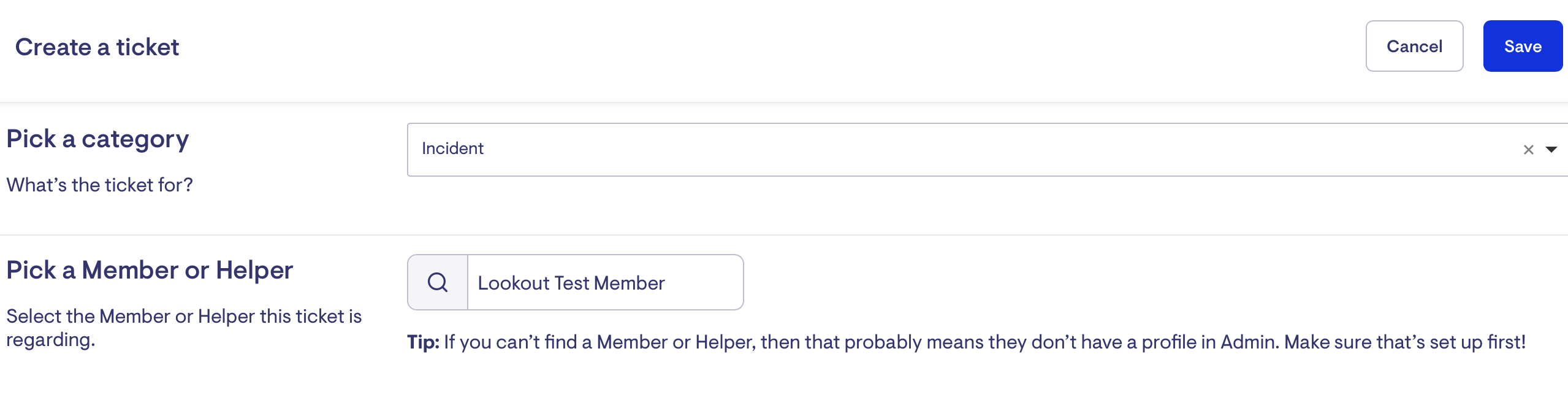 Internal Admin Staff can report an incident either via the report an incident website or directly within Lookout. This is done by creating a Ticket and selecting the subject of the incident through a searchable field.