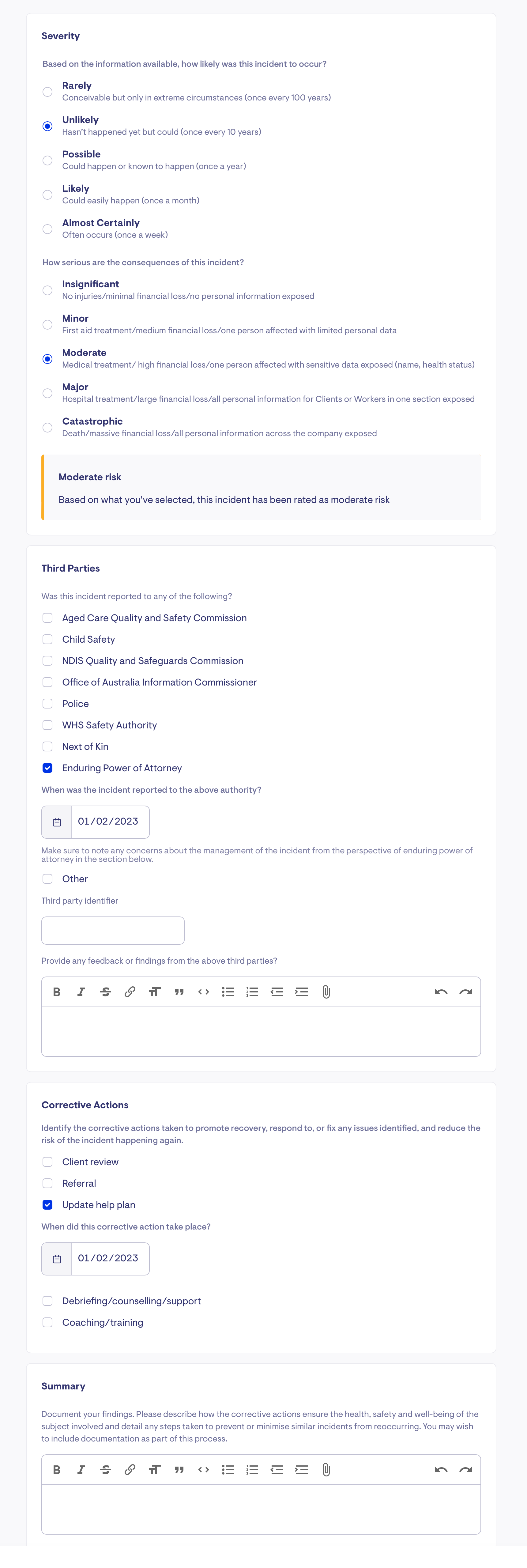 The incident summary form captures: