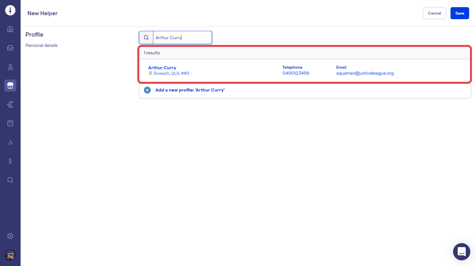 Enter the name of the helper into the profile search field. If there is an existing profile that matches the name entered, you can select the profile to create a helper using the profile details.