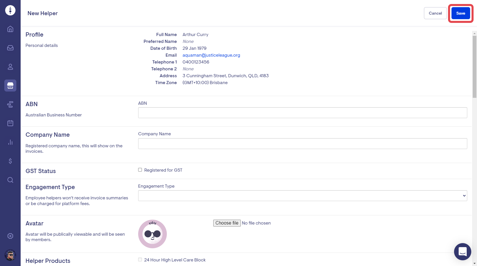 Enter the relevant helper details and select Save.