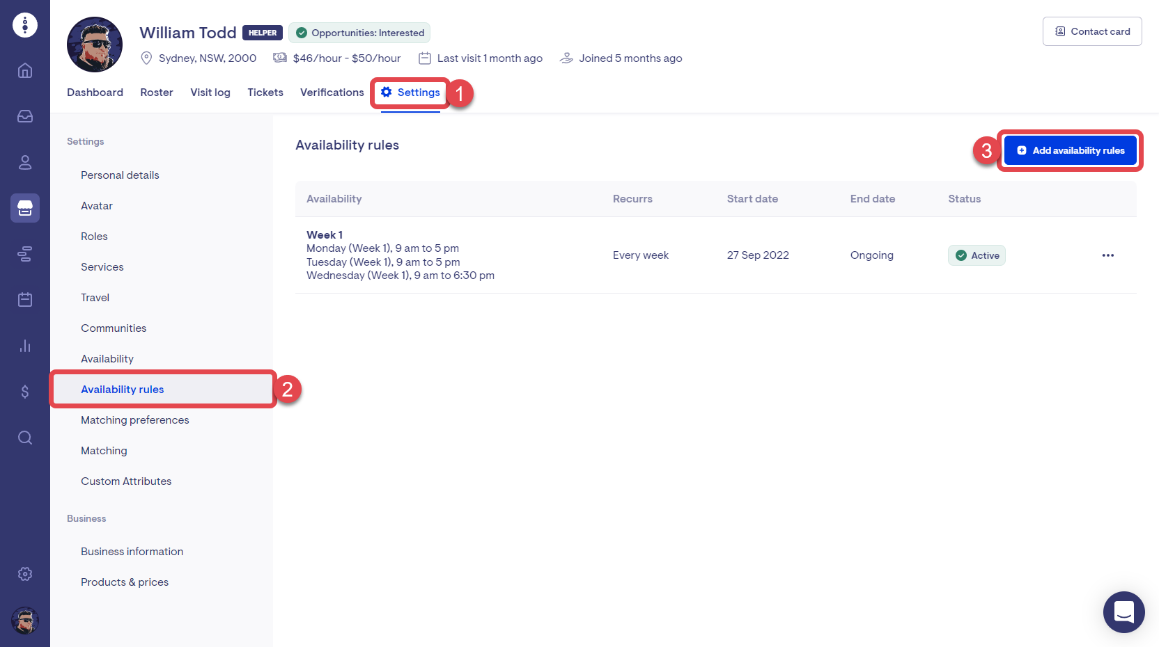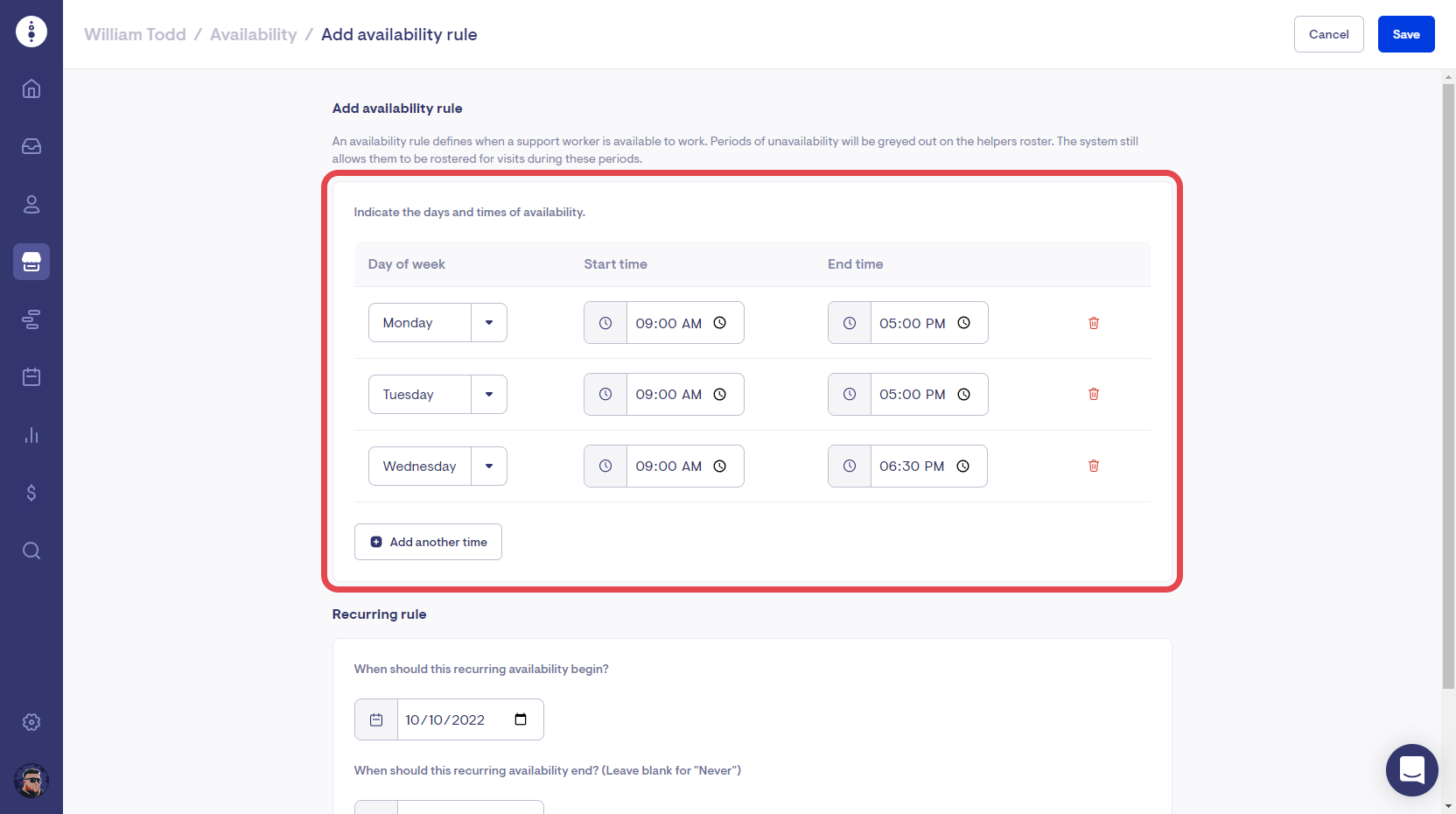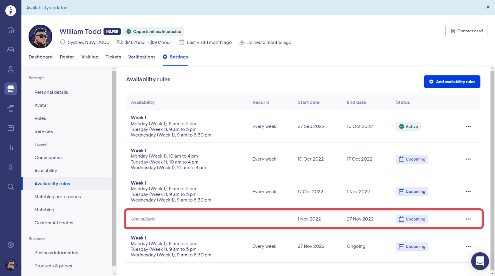Lookout now makes it easier than ever to update your helper's availability rules when they change. When adding a new availability rule, the previous days and times are copied across so that amendments can be made without having to fill in the whole form from scratch.