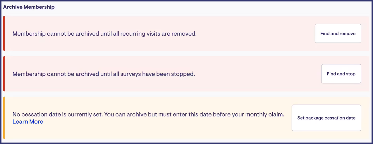 To help improve clarity and usability we have included several checks before you can archive a membership. These checks include if the membership still has recurring visits or surveys assigned and provides guidance on setting a cessation date before archiving the membership.