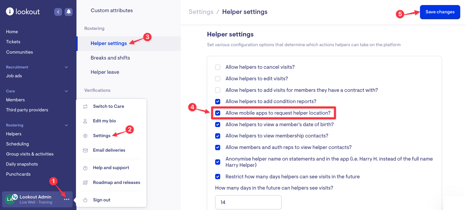 Once this setting is enabled, your Admin environment will include the new geotagging elements. Your Support Workers will also be asked to grant the app location permissions the first time they check in for a visit after the setting is turned on.