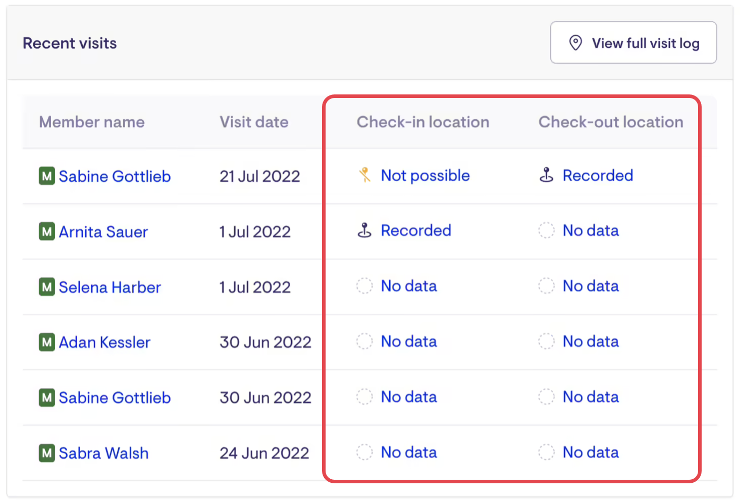 The example below is what the Visit log details modal will display if no check-in or check-out location data was recorded.