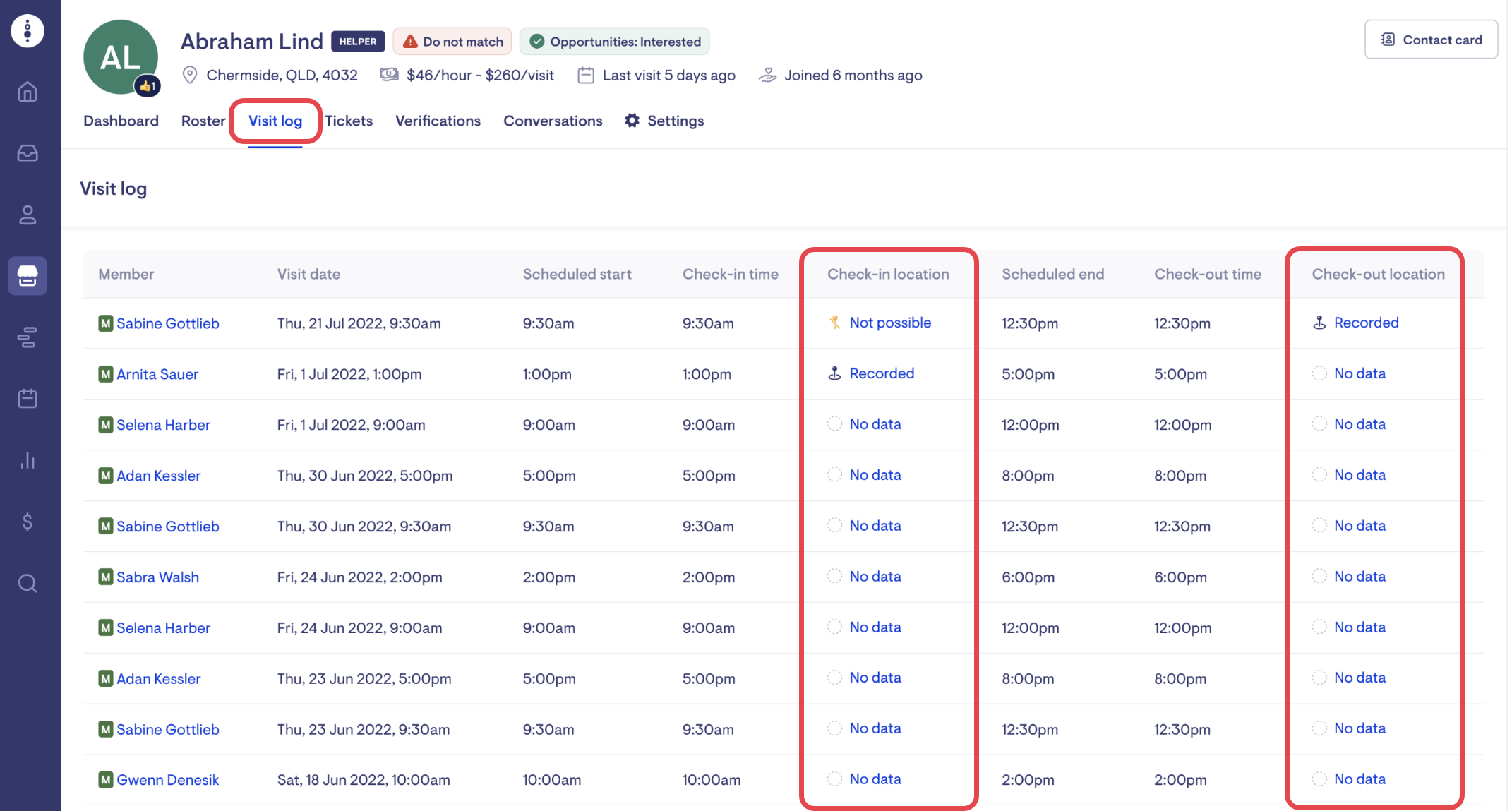 From the helper dashboard you can see check-in and check-out details under Recent Visits.
