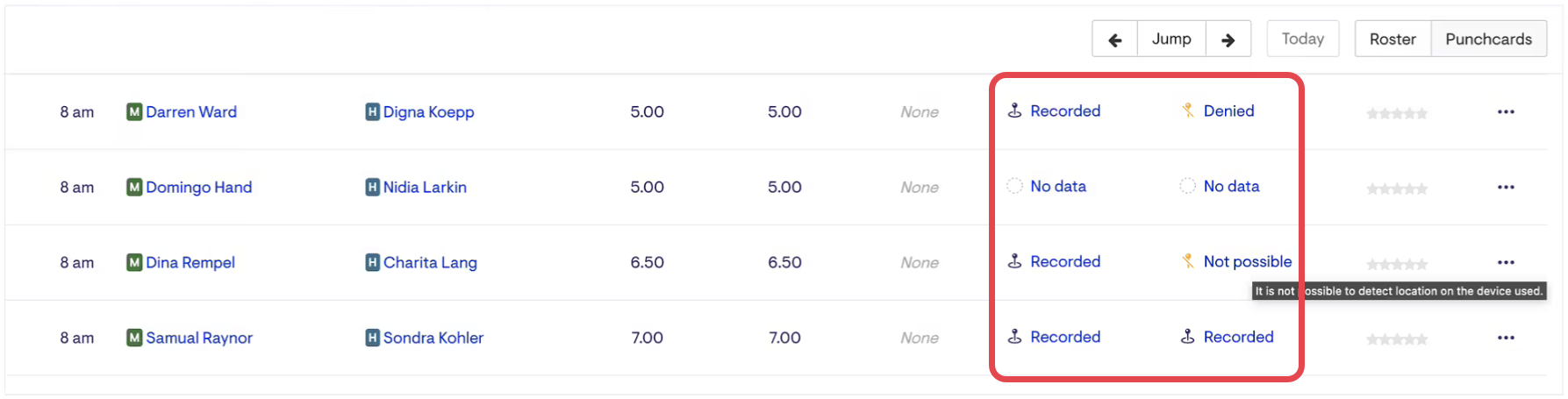 You can open a detailed view of the check-in and check-out location data by selecting the relevant check-in or check-out record. (Denied, Not possible, No data and Recorded)
