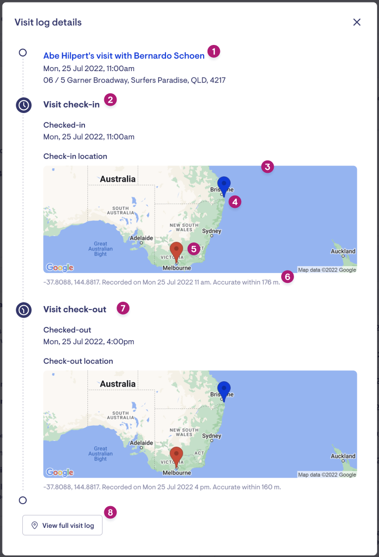 When location data has successfully been recorded for both check-in and check-out you will see a Visit log modal with a map for both check-in and check-out.