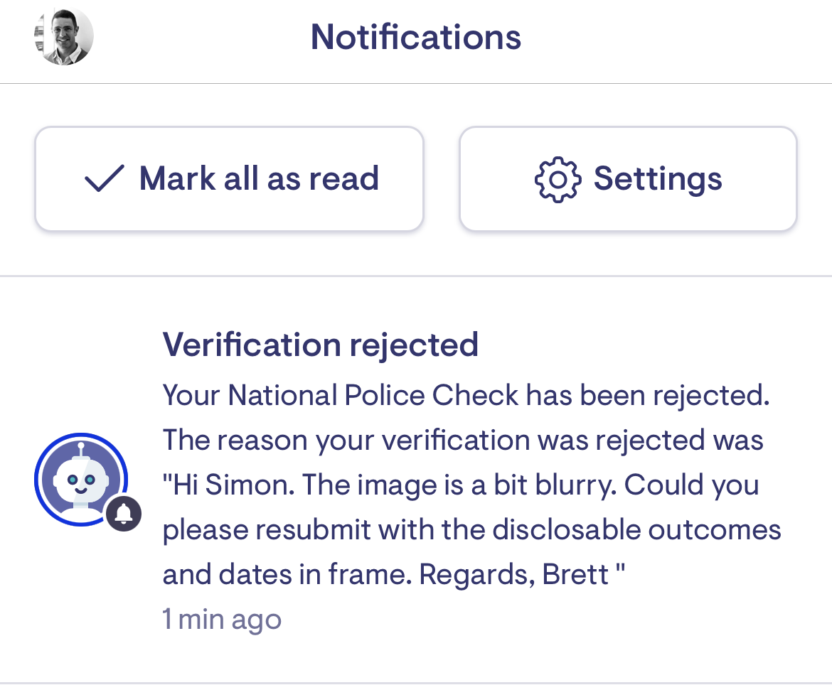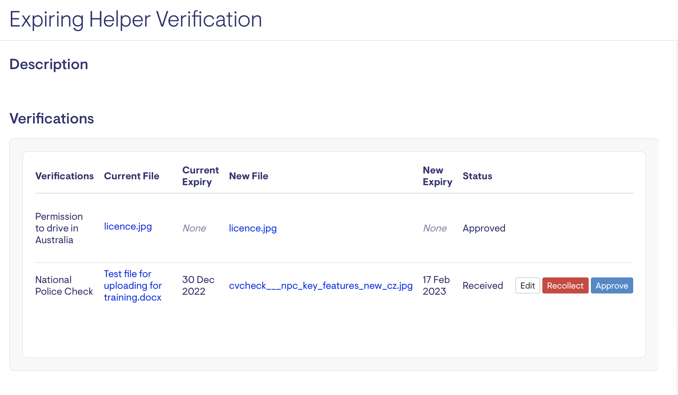 This provides insight and transparency to all staff and shows who approved a Verification, why a Verification has been sent for recollection and notifies the staff member when the Worker has uploaded a Verification.