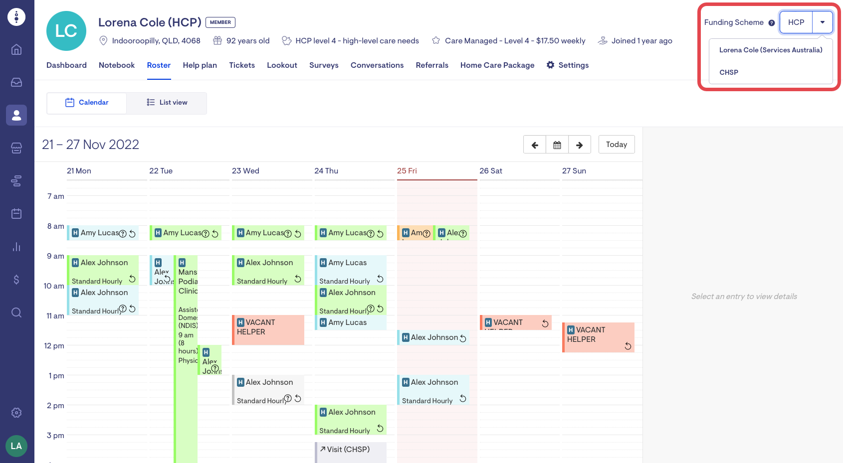 When a client has more than one Membership, there are two ways to switch between them. You can either click on the visit card from an alternate Membership within the roster (as described above) or use the funding scheme switcher at the top right of the Membership screen.