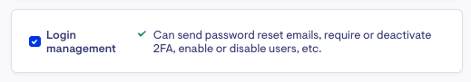 The Login Management Access Role permission allows you to reset passwords and two-factor authentication for other users and log out, enable, or disable user accounts.
