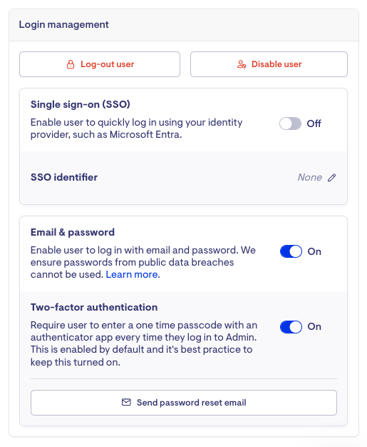 How to reset a users password, reset two-factor authentication, log out a user or enable/disable a user.