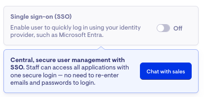 If your instance is not yet configured to support SSO, this option will be disabled. To start using this feature, contact our account management team by clicking the 'Chat with Sales' button.