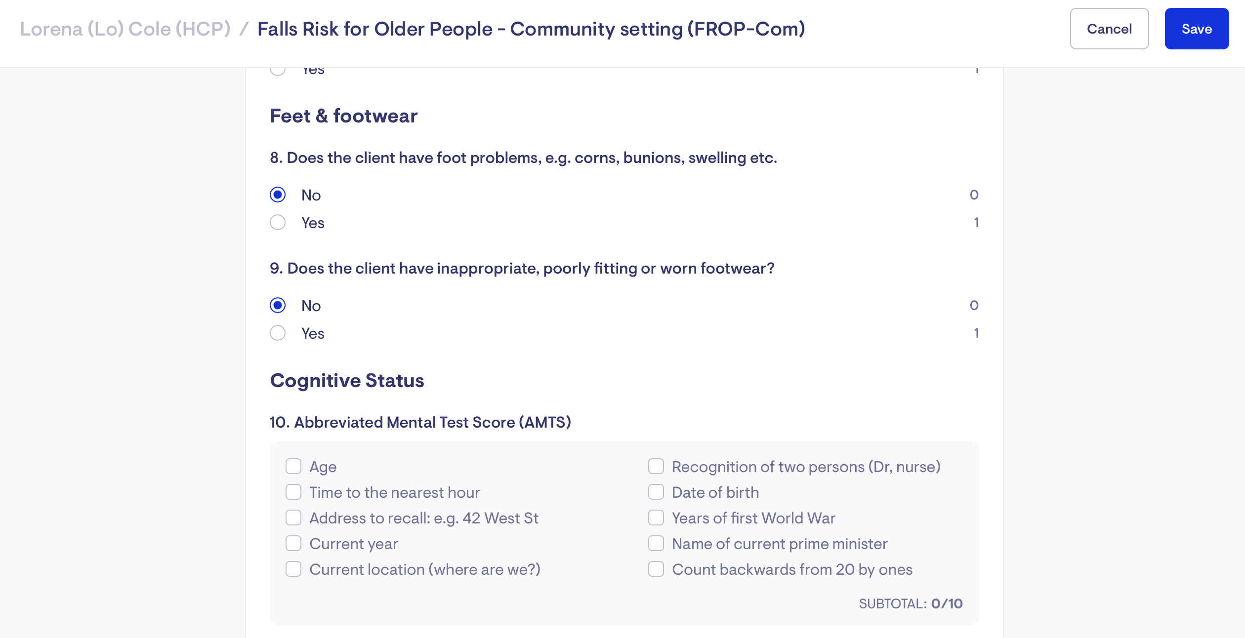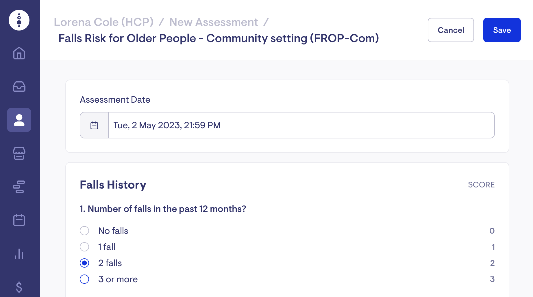 Select the "Falls Risk for Older People - Community setting (FROP-Com)" assessment.