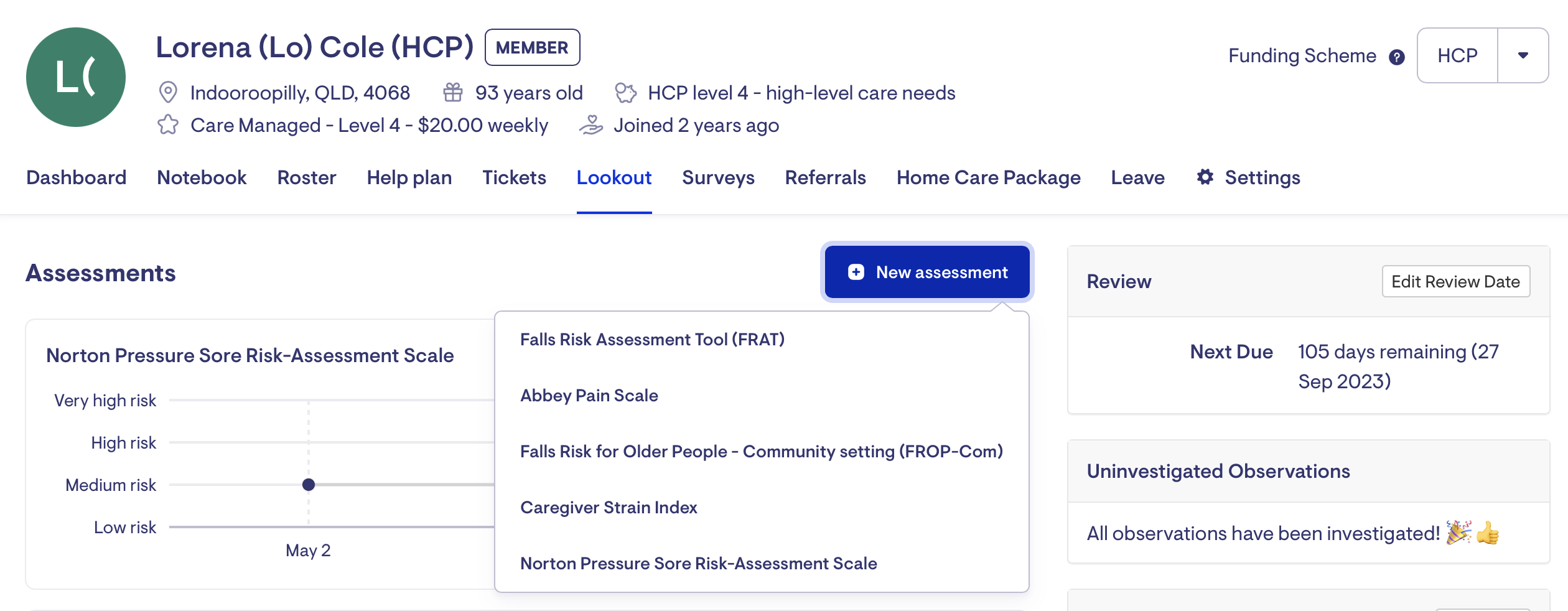 To complete a new FROP-Com assessment, navigate to the Lookout tab on a Membership and click 'New Assessment'.
