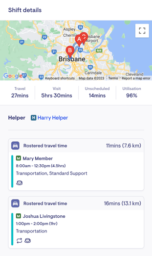 Shift Details displays important information including the travel time, visit time, unscheduled time, and utilisation percentage. The utilisation percentage shows the amount of time spent travelling, in-visit, and on paid and unpaid breaks from the beginning to the end of the shift. On the other hand, unscheduled time refers to the minutes that are not allocated for travel, visits, or breaks throughout the entire shift.