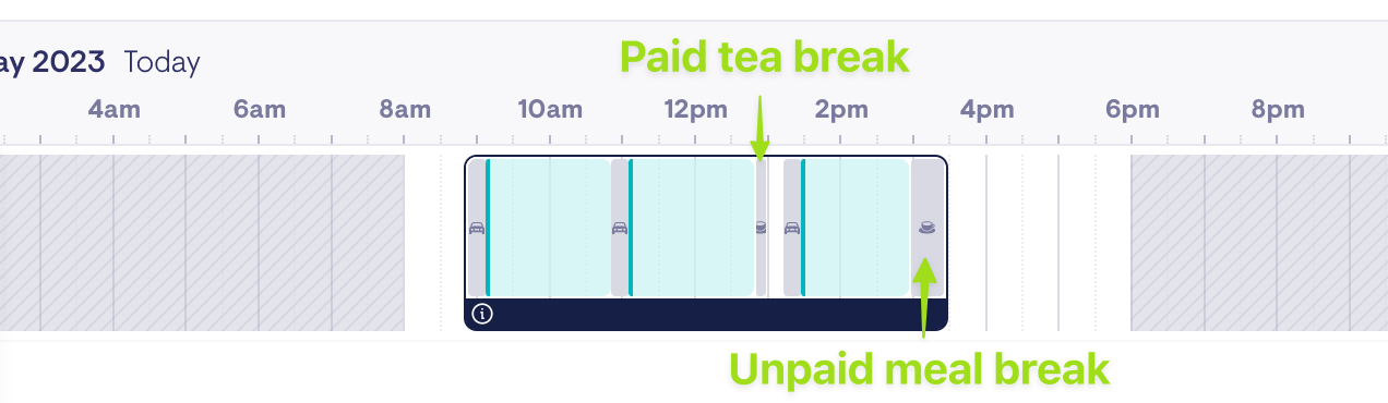 Example: The SCHADS Award requires a paid 10-minute tea break after 4 hours, an additional unpaid meal break after 5 hours, and another paid 10-minute tea break when over 8 hours.